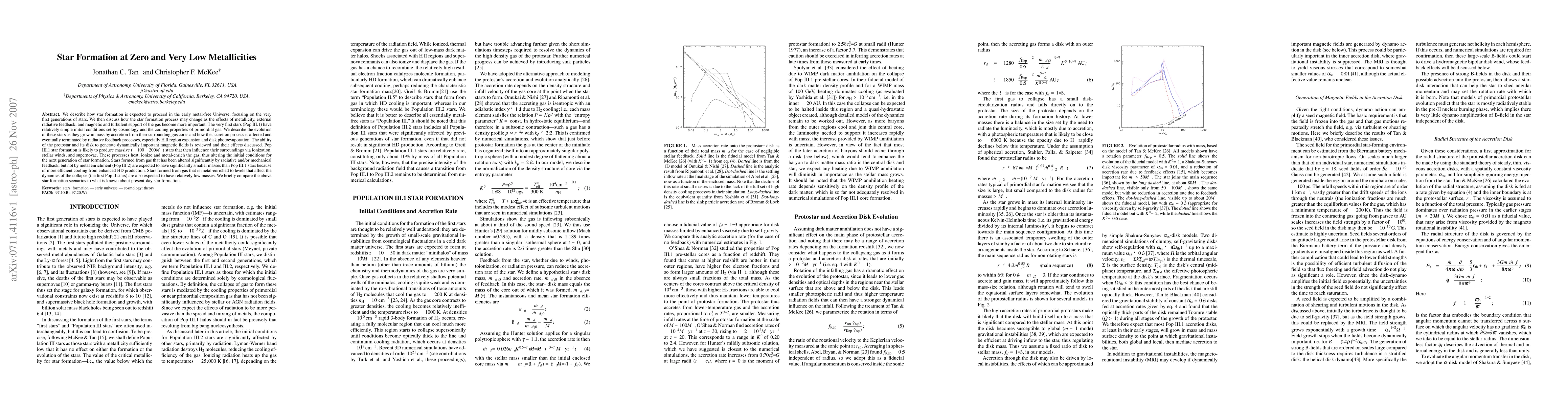 We describe how star formation is expected to proceed in the early metal-free Universe, focusing on the very first generations of stars. We then discuss how the star formation process may change as the effects of metallicity, external radiative feedback, and magnetic and turbulent support of the gas become more important. The very first stars (Pop III.1) have relatively simple initial conditions set by cosmology and the cooling properties of primordial gas. We describe the evolution of these stars as they grow in mass by accretion from their surrounding gas cores and how the accretion process is affected and eventually terminated by radiative feedback processes, especially HII region expansion and disk photoevaporation. The ability of the protostar and its disk to generate dynamically important magnetic fields is reviewed and their effects discussed. Pop III.1 star formation is likely to produce massive (~100-200Msun) stars that then influence their surroundings via ionization, stellar winds, and supernovae. These processes heat, ionize and metal-enrich the gas, thus altering the initial conditions for the next generation of star formation. Stars formed from gas that has been altered significantly by radiative and/or mechanical feedback, but not by metal enrichment (Pop III.2) are expected to have significantly smaller masses than Pop III.1 stars because of more efficient cooling from enhanced HD production. Stars formed from gas that is metal-enriched to levels that affect the dynamics of the collapse (the first Pop II stars) are also expected to have relatively low masses. We briefly compare the above star formation scenarios to what is known about present-day star formation.