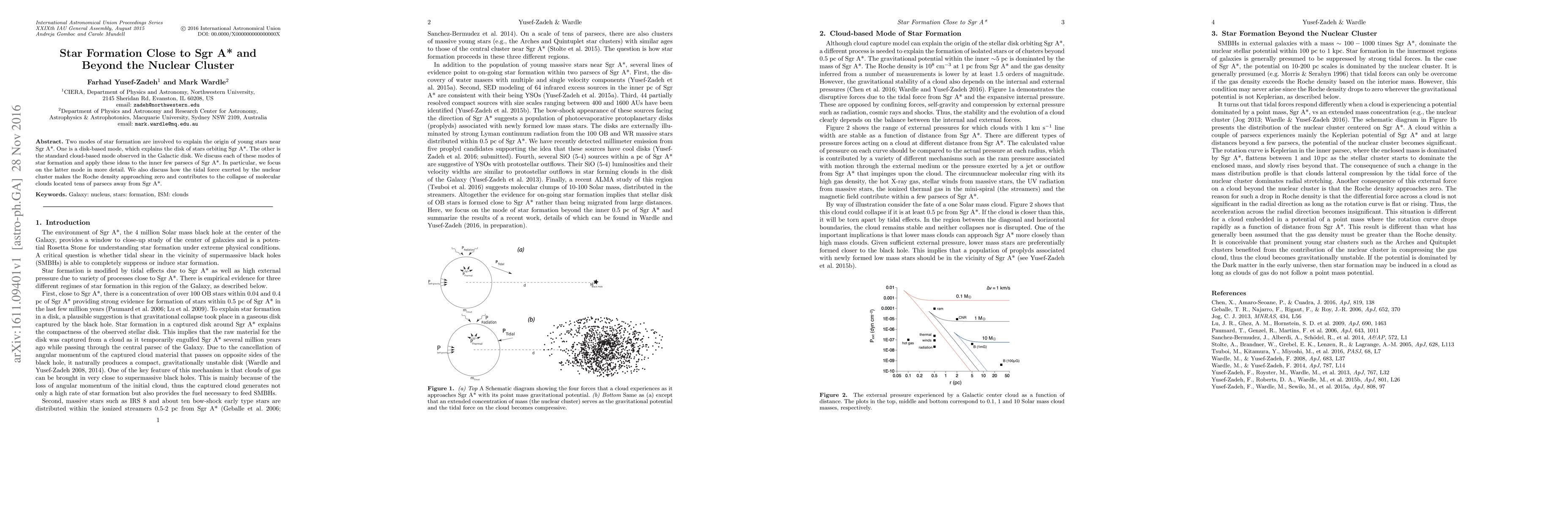 This paper explores two star formation modes near Sgr A*: a disk-based mode explaining the orbiting star disk and a standard cloud-based mode observed in the Galactic disk. It focuses on the latter, detailing how tidal forces from the nuclear cluster reduce Roche density, facilitating cloud collapse and star formation.