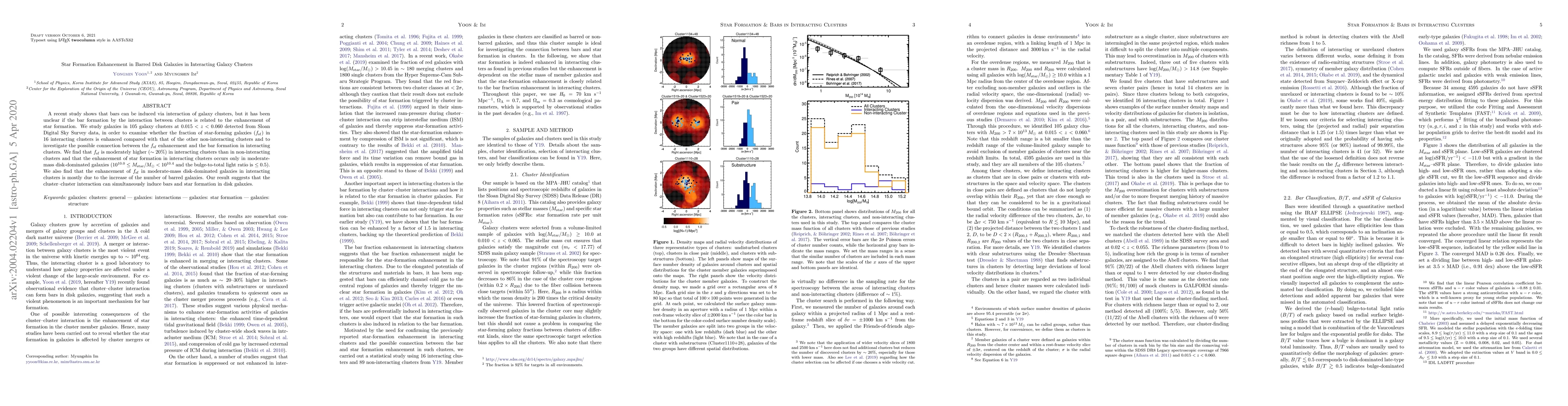 This study investigates star formation enhancement in barred disk galaxies within interacting galaxy clusters, finding a $\sim20\%$ higher fraction of star-forming galaxies in such clusters compared to non-interacting ones. The enhancement is primarily observed in moderate-mass disk-dominated galaxies, and it correlates with an increase in barred galaxies, suggesting that cluster interactions induce both bar formation and star formation.