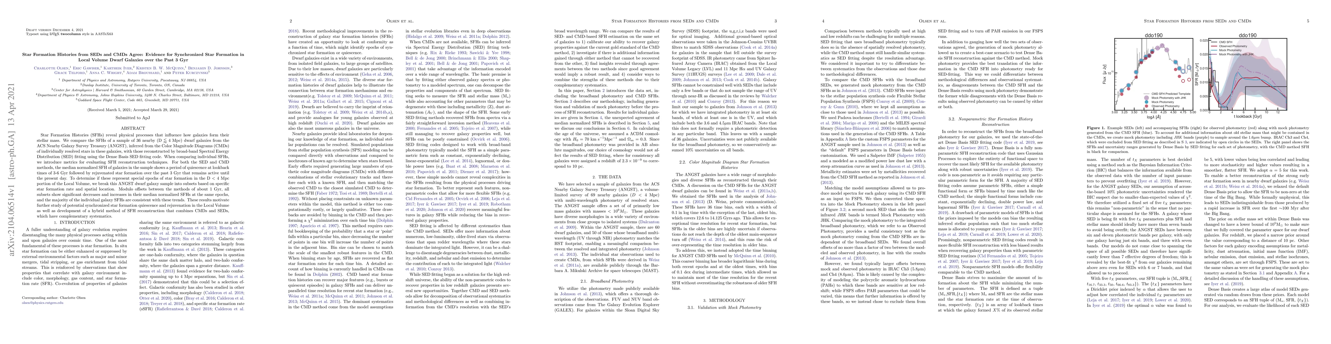 This study compares star formation histories (SFHs) of 36 nearby dwarf galaxies derived from both Color Magnitude Diagrams (CMDs) and Spectral Energy Distribution (SED) fitting, revealing synchronized periods of quiescence and rejuvenated star formation over the last 3 Gyr. The findings suggest a potential synchronized star formation pattern in the Local Volume.
