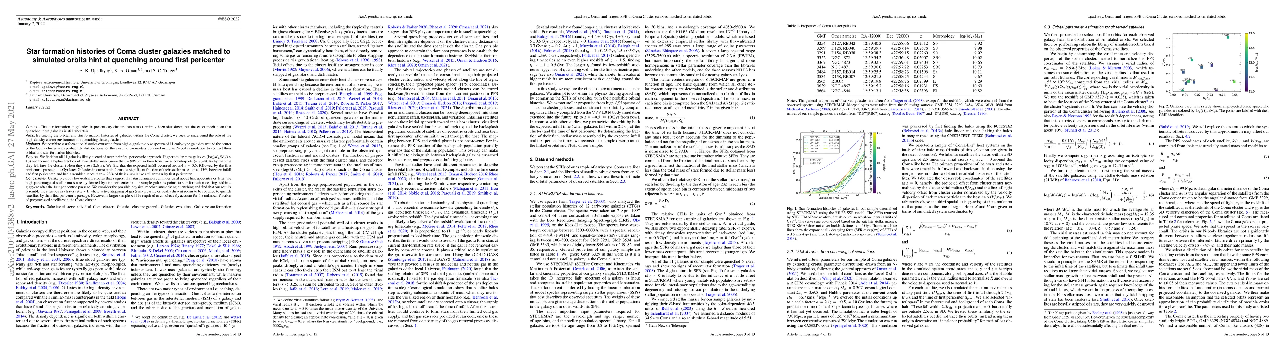 This study traces the orbital and star formation histories of 11 early-type galaxies in the Coma cluster, finding that star formation likely ceased around the first pericentric passage. The galaxies had formed most of their stellar mass before infall, with significant quenching occurring shortly after their first pericenter.