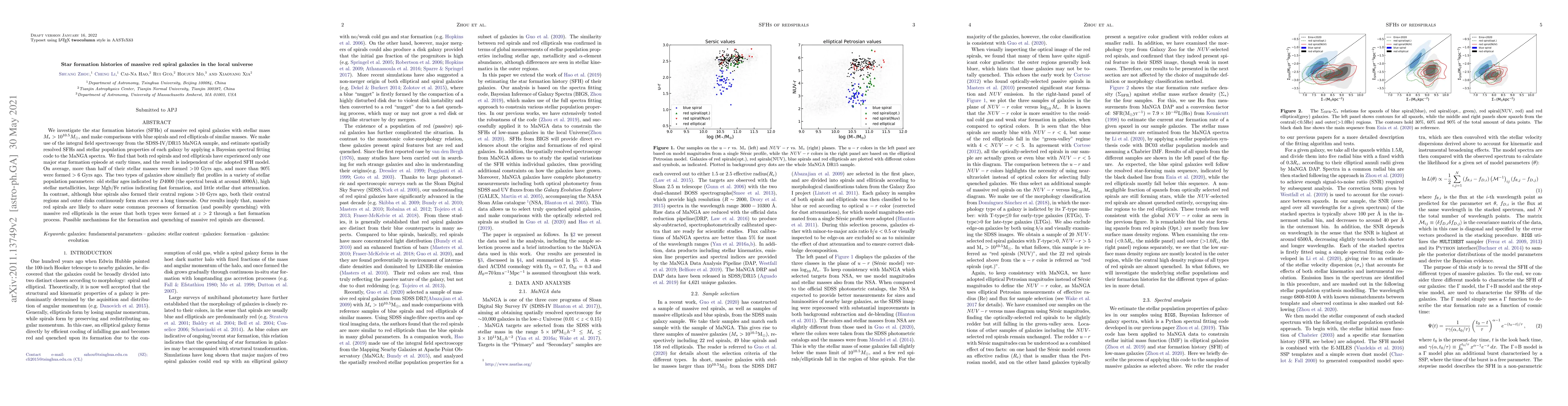 This paper investigates the star formation histories of massive red spiral galaxies, finding that they experienced a single major star formation episode at early times, similar to red ellipticals, with over 90% of their stellar mass formed more than 6 Gyrs ago. In contrast, blue spirals continue to form stars over a longer timescale. The study suggests that massive red spirals share common formation and quenching processes with red ellipticals.