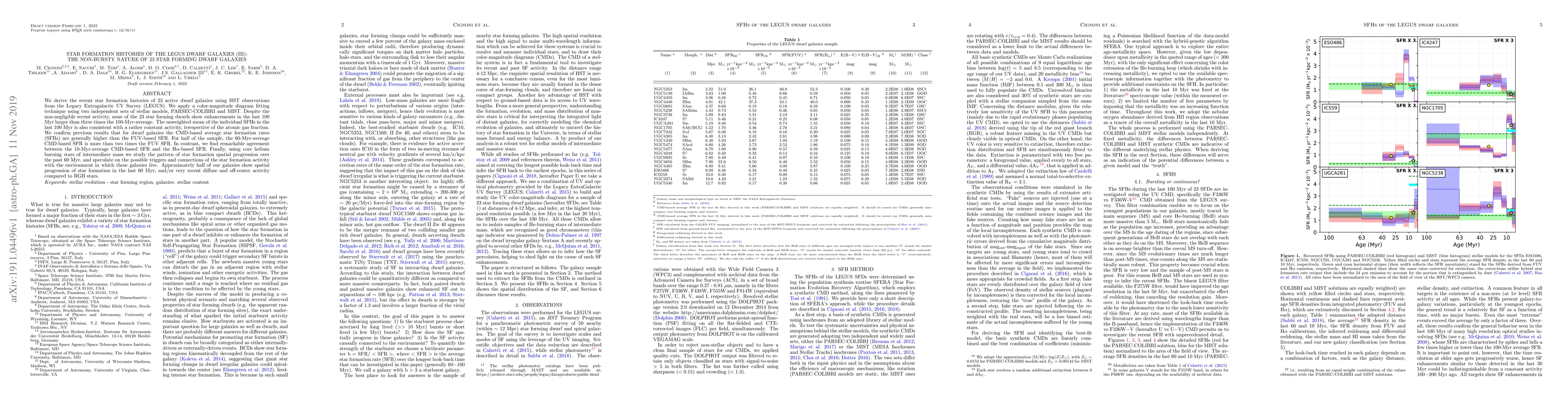 This paper analyzes the star formation histories of 23 active dwarf galaxies using HST data from LEGUS, finding no significant bursts of star formation in the last 100 Myr. The study confirms that the star formation rates derived from color-magnitude diagrams are generally higher than those from FUV data, and suggests a spatial progression of star formation in about half of the galaxies.
