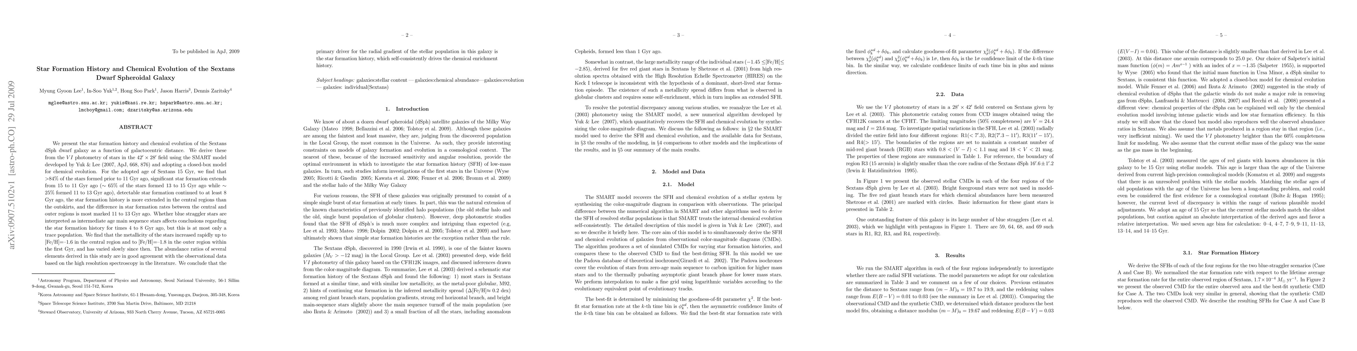 We present the star formation history and chemical evolution of the Sextans dSph dwarf galaxy as a function of galactocentric distance. We derive these from the $VI$ photometry of stars in the $42' \times 28'$ field using the SMART model developed by Yuk & Lee (2007, ApJ, 668, 876) and adopting a closed-box model for chemical evolution. For the adopted age of Sextans 15 Gyr, we find that $>$84% of the stars formed prior to 11 Gyr ago, significant star formation extends from 15 to 11 Gyr ago ($\sim$ 65% of the stars formed 13 to 15 Gyr ago while $\sim$ 25% formed 11 to 13 Gyr ago), detectable star formation continued to at least 8 Gyr ago, the star formation history is more extended in the central regions than the outskirts, and the difference in star formation rates between the central and outer regions is most marked 11 to 13 Gyr ago. Whether blue straggler stars are interpreted as intermediate age main sequence stars affects conclusions regarding the star formation history for times 4 to 8 Gyr ago, but this is at most only a trace population. We find that the metallicity of the stars increased rapidly up to [Fe/H]=--1.6 in the central region and to [Fe/H]=--1.8 in the outer region within the first Gyr, and has varied slowly since then. The abundance ratios of several elements derived in this study are in good agreement with the observational data based on the high resolution spectroscopy in the literature. We conclude that the primary driver for the radial gradient of the stellar population in this galaxy is the star formation history, which self-consistently drives the chemical enrichment history.