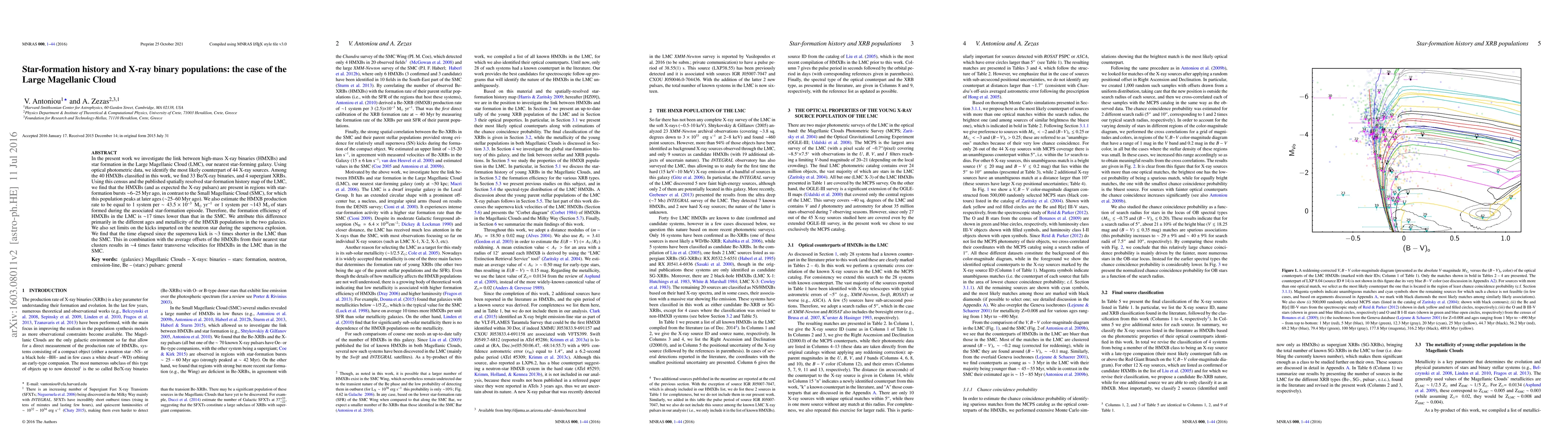 In the present work we investigate the link between high-mass X-ray binaries (HMXBs) and star formation in the Large Magellanic Cloud (LMC), our nearest star-forming galaxy. Using optical photometric data, we identify the most likely counterpart of 44 X-ray sources. Among the 40 HMXBs classified in this work, we find 33 Be/X-ray binaries, and 4 supergiant XRBs. Using this census and the published spatially resolved star-formation history map of the LMC, we find that the HMXBs (and as expected the X-ray pulsars) are present in regions with star-formation bursts $\sim$6-25 Myr ago, in contrast to the Small Magellanic Cloud (SMC), for which this population peaks at later ages ($\sim$25-60 Myr ago). We also estimate the HMXB production rate to be equal to 1 system per $\sim43.5\times10^{-3}$ Mo/yr, or 1 system per $\sim$143 Mo of stars formed during the associated star-formation episode. Therefore, the formation efficiency of HMXBs in the LMC is $\sim$17 times lower than that in the SMC. We attribute this difference primarily in the different ages and metallicity of the HMXB populations in the two galaxies. We also set limits on the kicks imparted on the neutron star during the supernova explosion. We find that the time elapsed since the supernova kick is $\sim$3 times shorter in the LMC than the SMC. This in combination with the average offsets of the HMXBs from their nearest star clusters results in $\sim$4 times faster transverse velocities for HMXBs in the LMC than in the SMC.