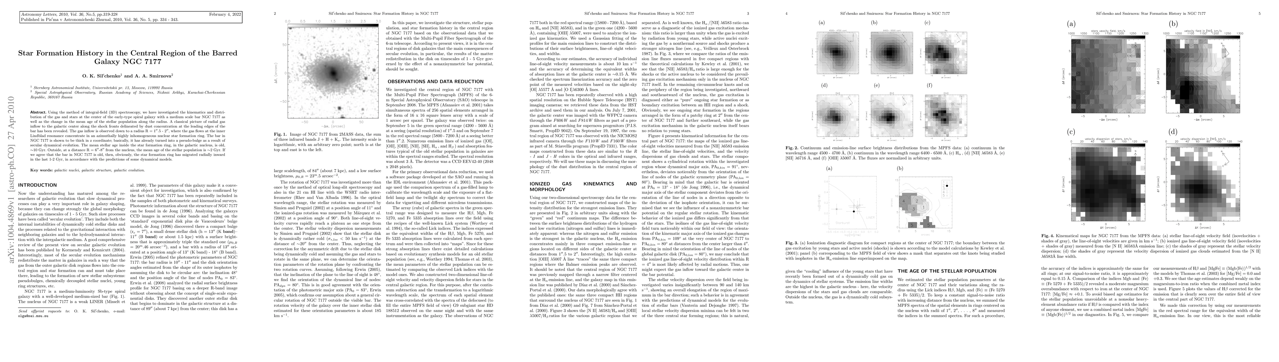 Using the method of integral-field (3D) spectroscopy, we have investigated the kinematics and distribution of the gas and stars at the center of the early-type spiral galaxy with a medium scale bar NGC 7177 as well as the change in the mean age of the stellar population along the radius. A classical picture of radial gas inflow to the galactic center along the shock fronts delineated by dust concentration at the leading edges of the bar has been revealed. The gas inflow is observed down to a radius R = 1".5 -- 2", where the gas flows at the inner Lindblad resonance concentrate in an azimuthally highly inhomogeneous nuclear star formation ring. The bar in NGC 7177 is shown to be thick in z coordinate; basically, it has already turned into a pseudo-bulge as a result of secular dynamical evolution. The mean stellar age inside the star formation ring, in the galactic nucleus, is old, ~10 Gyr. Outside, at a distance R = 6" - 8" from the nucleus, the mean age of the stellar population is ~2 Gyr. If we agree that the bar in NGC 7177 is old, then, obviously, the star formation ring has migrated radially inward in the last 1-2 Gyr, in accordance with the predictions of some dynamical models.