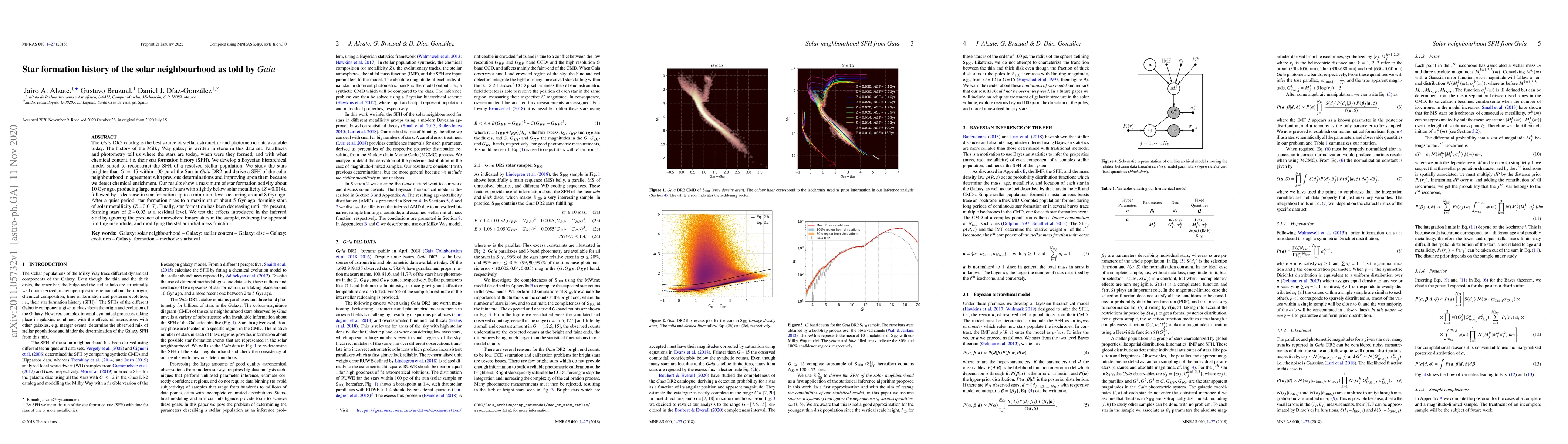 The Gaia DR2 catalog enables a detailed reconstruction of the solar neighbourhood's star formation history (SFH) using a Bayesian hierarchical model, revealing peak star formation 10 Gyr ago, followed by a decline, and a secondary peak 5 Gyr ago, with ongoing gradual decline to present-day levels. The study also examines the impact of unresolved binary stars and stellar initial mass function on the inferred SFH.