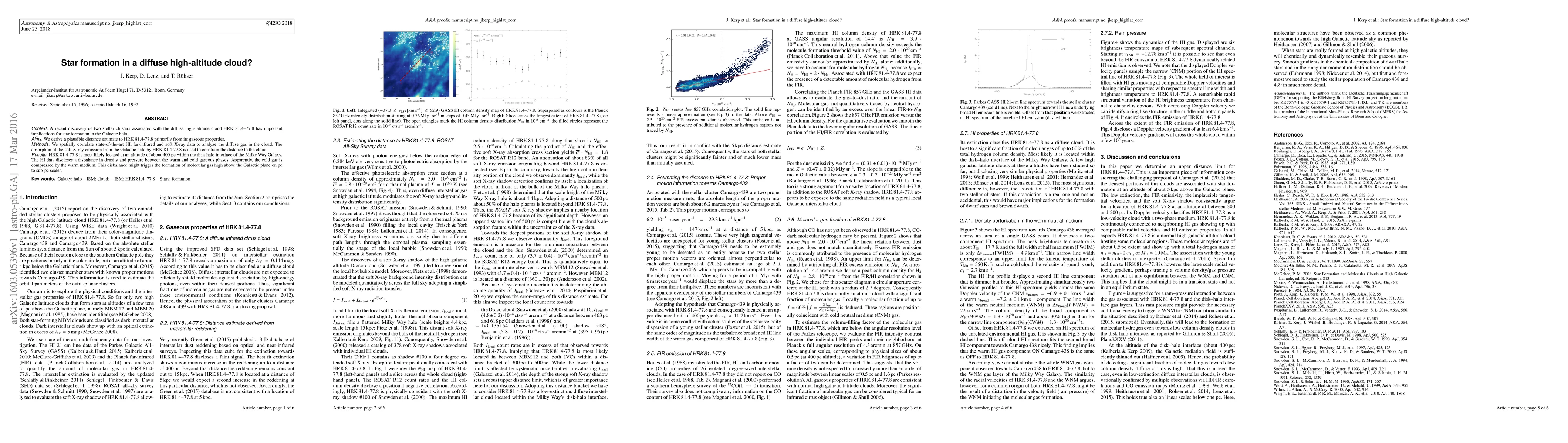 A recent discovery of two stellar clusters associated with the diffuse high-latitude cloud HRK 81.4-77.8 has important implications for star formation in the Galactic halo. We derive a plausible distance estimate to HRK 81.4-77.8 primarily from its gaseous properties. We spatially correlate state-of-the-art HI, far-infrared and soft X-ray data to analyze the diffuse gas in the cloud. The absorption of the soft X-ray emission from the Galactic halo by HRK 81.4-77.8 is used to constrain the distance to the cloud. HRK 81.4-77.8 is most likely located at an altitude of about 400 pc within the disk-halo interface of the Milky Way Galaxy. The HI data discloses a disbalance in density and pressure between the warm and cold gaseous phases. Apparently, the cold gas is compressed by the warm medium. This disbalance might trigger the formation of molecular gas high above the Galactic plane on pc to sub-pc scales.