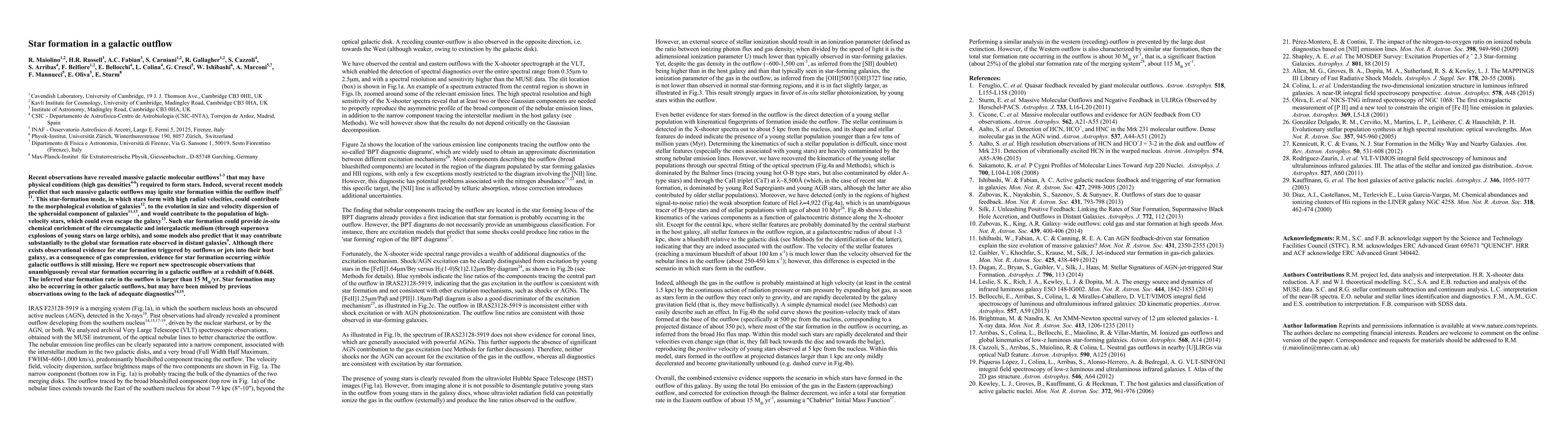 Recent observations have revealed massive galactic molecular outflows that may have physical conditions (high gas densities) required to form stars. Indeed, several recent models predict that such massive galactic outflows may ignite star formation within the outflow itself. This star-formation mode, in which stars form with high radial velocities, could contribute to the morphological evolution of galaxies, to the evolution in size and velocity dispersion of the spheroidal component of galaxies, and would contribute to the population of high-velocity stars, which could even escape the galaxy. Such star formation could provide in-situ chemical enrichment of the circumgalactic and intergalactic medium (through supernova explosions of young stars on large orbits), and some models also predict that it may contribute substantially to the global star formation rate observed in distant galaxies. Although there exists observational evidence for star formation triggered by outflows or jets into their host galaxy, as a consequence of gas compression, evidence for star formation occurring within galactic outflows is still missing. Here we report new spectroscopic observations that unambiguously reveal star formation occurring in a galactic outflow at a redshift of 0.0448. The inferred star formation rate in the outflow is larger than 15 Msun/yr. Star formation may also be occurring in other galactic outflows, but may have been missed by previous observations owing to the lack of adequate diagnostics.