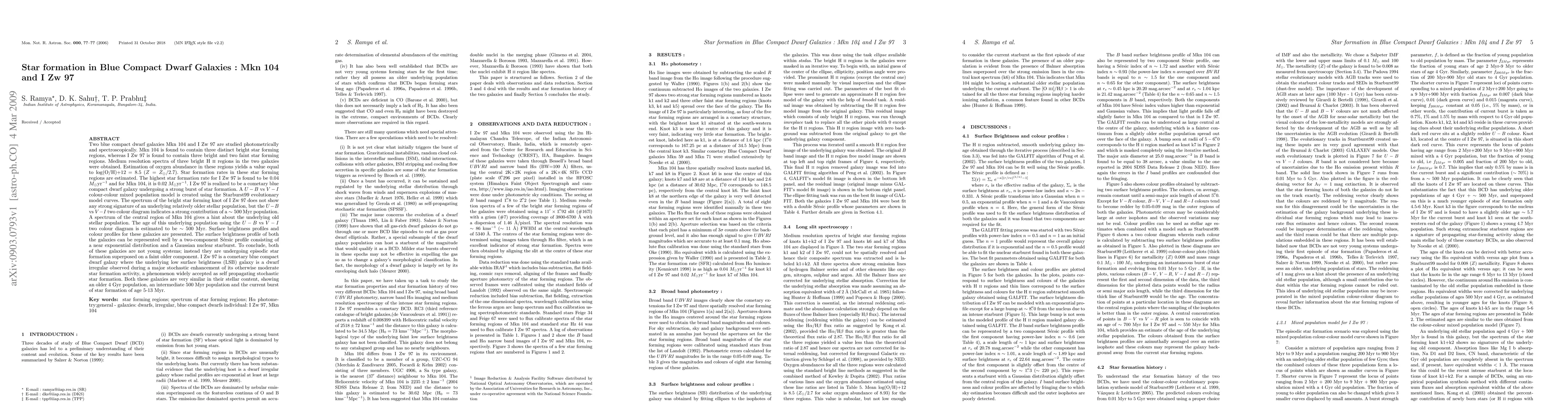 This paper investigates the star formation in two blue compact dwarf galaxies, Mkn 104 and I Zw 97, revealing distinct star-forming regions and estimating their star formation rates. The galaxies show similar stellar populations with an older 4 Gyr population, an intermediate 500 Myr population, and a current burst of star formation.