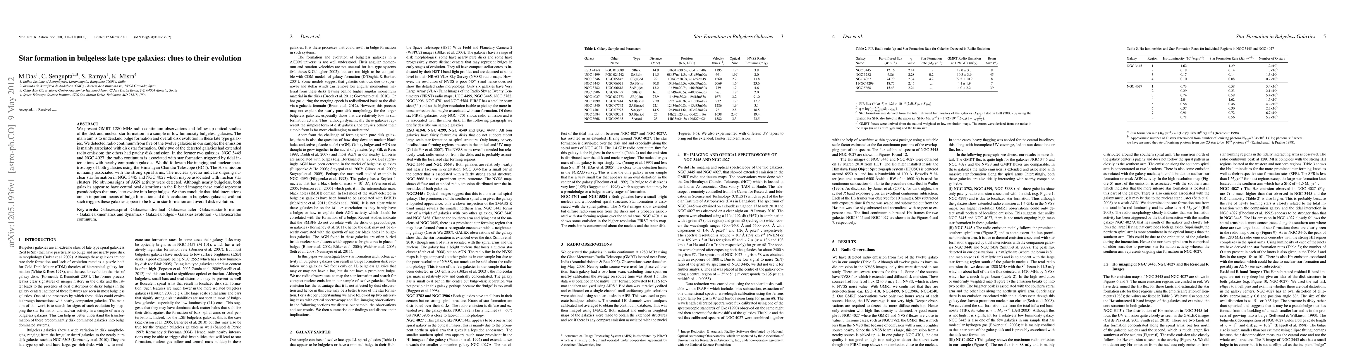 We present GMRT 1280 MHz radio continuum observations and follow-up optical studies of the disk and nuclear star formation in a sample of low luminosity bulgeless galaxies. The main aim is to understand bulge formation and overall disk evolution in these late type galaxies. We detected radio continuum from five of the twelve galaxies in our sample; the emission is mainly associated with disk star formation. Only two of the detected galaxies had extended radio emission; the others had patchy disk emission. In the former two galaxies, NGC3445 and NGC4027, the radio continuum is associated with star formation triggered by tidal interactions with nearby companion galaxies. We did follow-up Halpha imaging and nuclear spectroscopy of both galaxies using the Himalayan Chandra Telescope (HCT). The Halpha emission is mainly associated with the strong spiral arms. The nuclear spectra indicate ongoing nuclear star formation in NGC3445 and NGC4027 which maybe associated with nuclear star clusters. No obvious signs of AGN activity were detected. Although nearly bulgeless, both galaxies appear to have central oval distortions in the R band images; these could represent pseudobulges that may later evolve into large bulges. We thus conclude that tidal interactions are an important means of bulge formation and disk evolution in bulgeless galaxies; without such triggers these galaxies appear to be low in star formation and overall disk evolution.