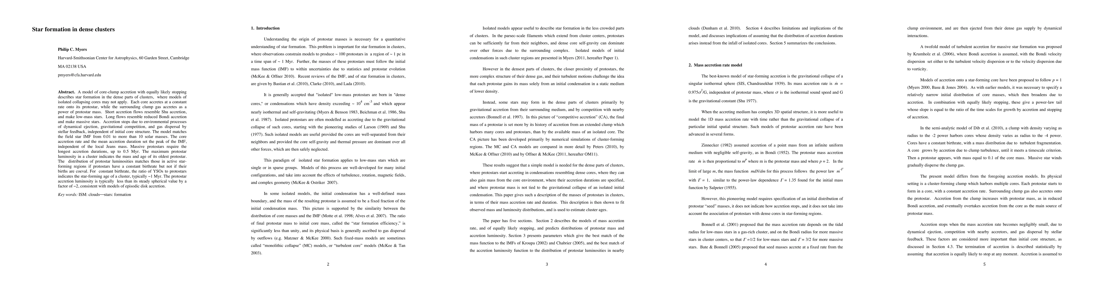 This model describes star formation in dense clusters, showing how core accretion rates and durations influence the mass of stars, with shorter flows producing low-mass stars and longer flows making massive stars.