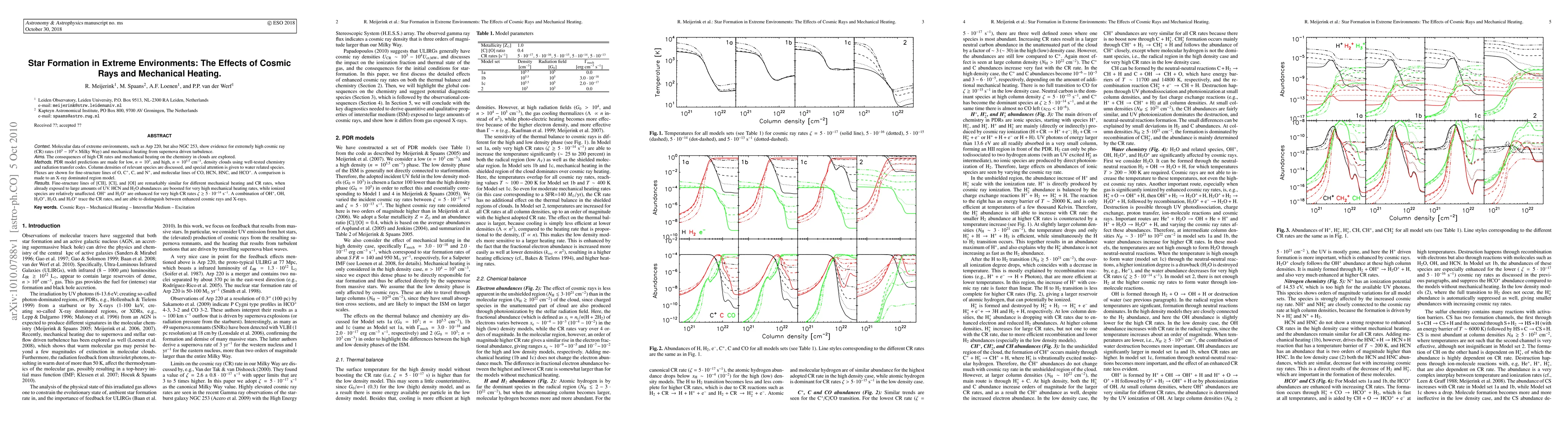 This paper investigates the impact of high cosmic ray rates and mechanical heating on molecular cloud chemistry in extreme environments like Arp 220 and NGC 253. Results show that while fine-structure lines remain similar, high mechanical heating boosts HCN and H2O abundances, and high cosmic ray rates enhance OH+ and H2O+ levels, allowing for differentiation between cosmic ray and X-ray influences.