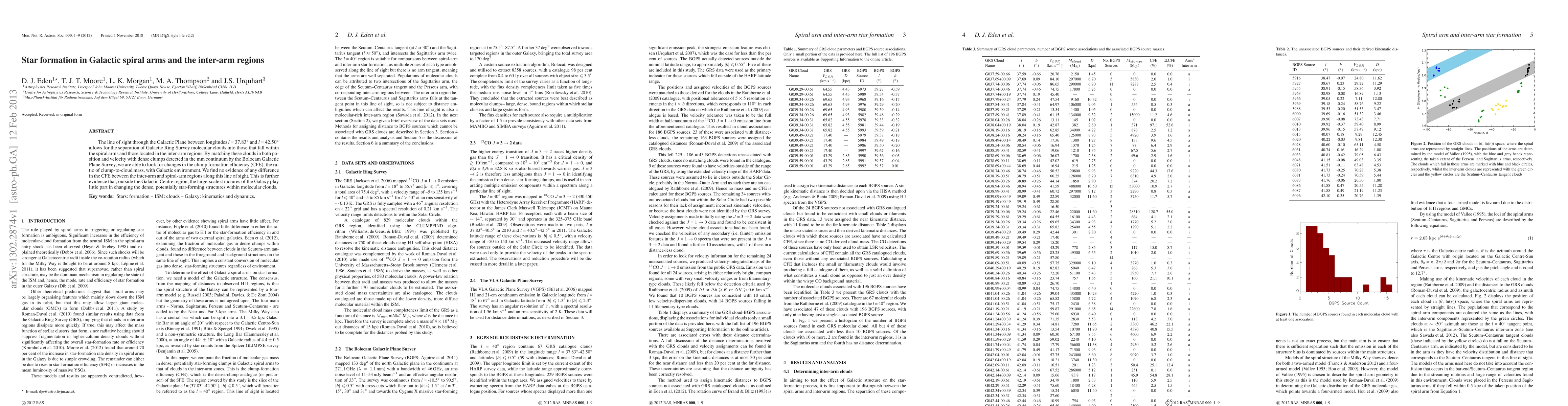 The line of sight through the Galactic Plane between longitudes l = 37.83 degr and l = 42.50 degr allows for the separation of Galactic Ring Survey molecular clouds into those that fall within the spiral arms and those located in the inter-arm regions. By matching these clouds in both position and velocity with dense clumps detected in the mm continuum by the Bolocam Galactic Plane Survey, we are able to look for changes in the clump formation efficiency (CFE), the ratio of clump-to-cloud mass, with Galactic environment. We find no evidence of any difference in the CFE between the inter-arm and spiral-arm regions along this line of sight. This is further evidence that, outside the Galactic Centre region, the large-scale structures of the Galaxy play little part in changing the dense, potentially star-forming structures within molecular clouds.