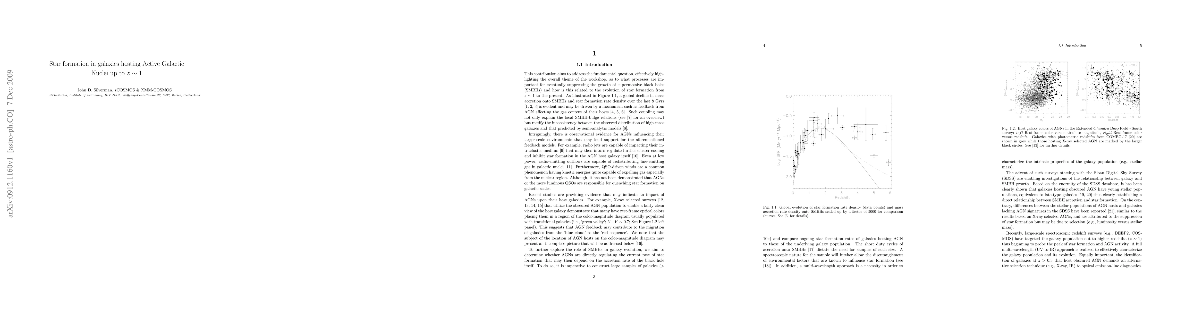 This paper reviews the connection between star formation and Active Galactic Nuclei (AGN) in galaxies up to redshift z~1, finding that AGN activity correlates with star formation rates, suggesting a co-evolutionary relationship. The study highlights that AGNs in star-forming galaxies exhibit similar evolutionary patterns and that AGN fraction increases with bluer galaxy colors, challenging interpretations in luminosity-limited samples.