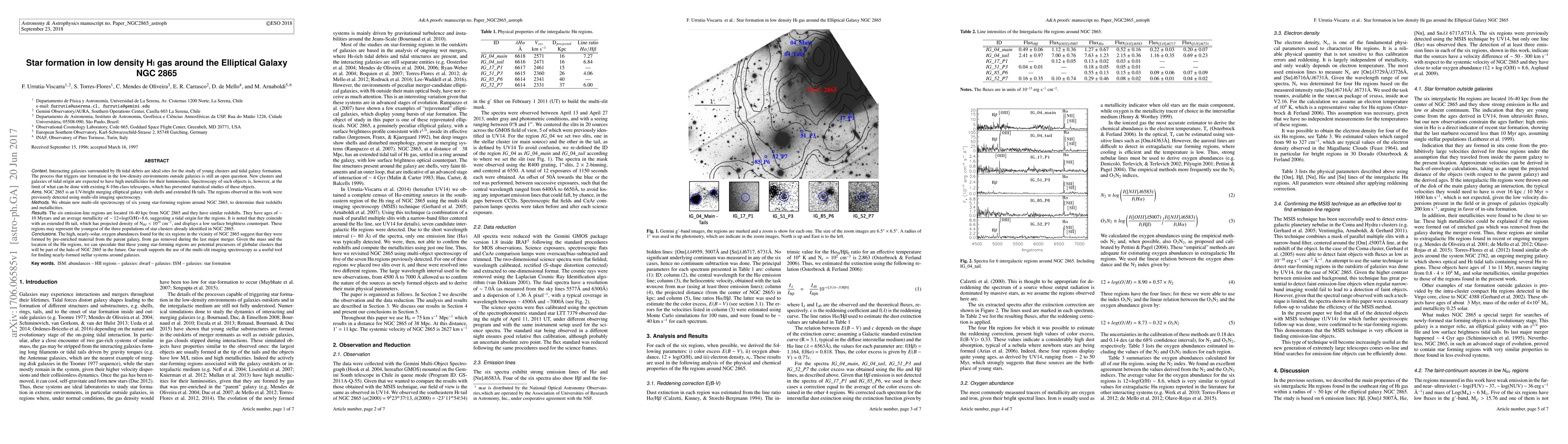 Interacting galaxies surrounded by HI tidal debris are ideal sites for the study of young clusters and tidal galaxy formation. The process that triggers star formation in the low-density environments outside galaxies is still an open question. New clusters and galaxies of tidal origin are expected to have high metallicities for their luminosities. Spectroscopy of such objects is, however, at the limit of what can be done with existing 8-10m class telescopes, which has prevented statistical studies of these objects. NGC2865 is an UV-bright merging elliptical galaxy with shells and extended HI tails. The regions observed in this work were previously detected using multi-slit imaging spectroscopy. We obtain new multislit spectroscopy of six young star-forming regions around NGC2865, to determine their redshifts and metallicities. The six emission-line regions are located 16-40 kpc from NGC2865 and they have similar redshifts. They have ages of ~10Myears and an average metallicity of 12+log(O/H) ~ 8.6, suggesting a tidal origin for the regions. It is noted that they coincide with an extended HI tail, which has projected density of N$_{HI}$ < 10$^{19}$ cm$^{-2}$, and displays a low surface brightness counterpart. These regions may represent the youngest of the three populations of star clusters already identified in NGC2865. The high, nearly-solar, oxygen abundances found for the six regions in the vicinity of NGC2865 suggest that they were formed by pre-enriched material from the parent galaxy, from gas removed during the last major merger. Given the mass and the location of the HII regions, we can speculate that these young star-forming regions are potential precursors of globular clusters that will be part of the halo of NGC2865 in the future. Our result supports the use of the multi-slit imaging spectroscopy as a useful tool for finding nearly-formed stellar systems around galaxies.