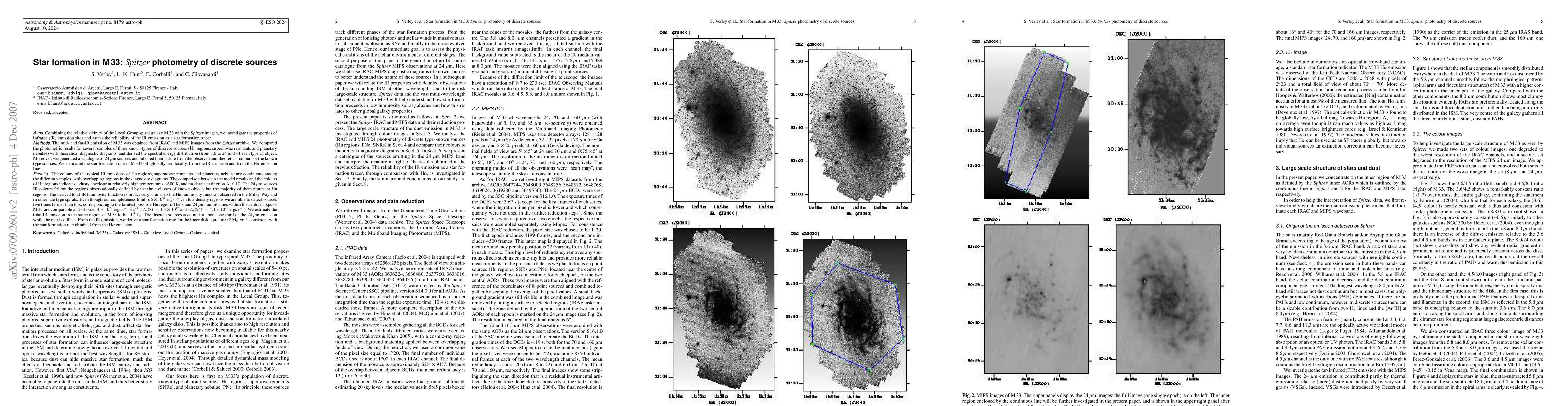 Combining the relative vicinity of the Local Group spiral galaxy M33 with the Spitzer images, we investigate the properties of infrared (IR) emission sites and assess the reliability of the IR emission as a star formation tracer. The mid- and far-IR emission of M33 was obtained from IRAC and MIPS images from the Spitzer archive. We compared the photometric results for several samples of three known types of discrete sources (HII regions, supernovae remnants and planetary nebulae) with theoretical diagnostic diagrams, and derived the spectral energy distribution (from 3.6 to 24 micron) of each type of object. Moreover, we generated a catalogue of 24 micron sources and inferred their nature from the observed and theoretical colours of the known type sources. We estimated the star formation rate in M33 both globally and locally, from the IR emission and from the Halpha emission line. The colours of the typical IR emissions of HII regions, supernovae remnants and planetary nebulae are continuous among the different samples, with overlapping regions in the diagnostic diagrams. The comparison between the model results and the colours of HII regions indicates a dusty envelope at relatively high temperatures ~600 K, and moderate extinction Av < 10. The 24 micron sources IR colours follow the regions observationally defined by the three classes of known objects but the majority of them represent HII regions. The derived total IR luminosity function is in fact very similar to the HII luminosity function observed in the Milky Way and in other late type spirals. Even though our completeness limit is 5x10^37 ergs s-1, in low density regions we are able to detect sources five times fainter than this, corresponding to the faintest possible HII region. [abridged]