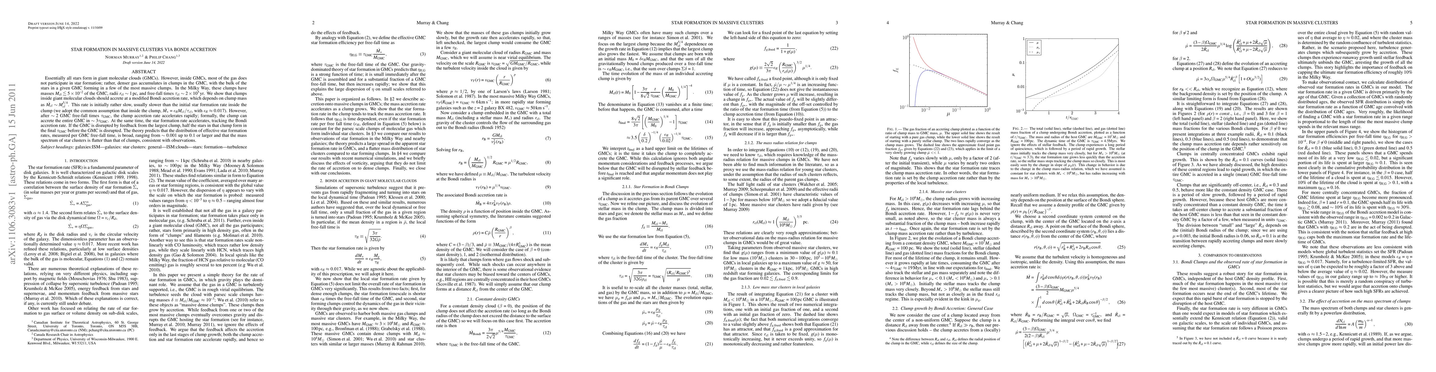 Essentially all stars form in giant molecular clouds (GMCs). However, inside GMCs, most of the gas does not participate in star formation; rather, denser gas accumulates in clumps in the GMC, with the bulk of the stars in a given GMC forming in a few of the most massive clumps. In the Milky Way, these clumps have masses $M_{\rm cl}\lesssim 5\times 10^{-2}$ of the GMC, radii $r_{\rm cl} \sim 1$pc, and free-fall times $\tau_{\rm cl} \sim 2\times 10^5\yr$. We show that clumps inside giant molecular clouds should accrete at a modified Bondi accretion rate, which depends on clump mass as $\dot M_{\rm cl}\sim M_{\rm cl}^{5/4}$. This rate is initially rather slow, usually slower than the initial star formation rate inside the clump (we adopt the common assumption that inside the clump, $\dot M_*=\epsilon_{\rm ff} M_{\rm cl}/\tau_{\rm cl}$, with $\epsilon_{\rm ff} \approx 0.017$). However, after $\sim 2$ GMC free-fall times $\tau_{\rm GMC}$, the clump accretion rate accelerates rapidly; formally, the clump can accrete the entire GMC in $\sim 3\tau_{\rm GMC}$. At the same time, the star formation rate accelerates, tracking the Bondi accretion rate. If the GMC is disrupted by feedback from the largest clump, half the stars in that clump form in the final $\taug$ before the GMC is disrupted. The theory predicts that the distribution of effective star formation rates, measured per GMC free-fall time, is broad, ranging from $\sim 0.001$ up to 0.1 or larger and that the mass spectrum of star clusters is flatter than that of clumps, consistent with observations.