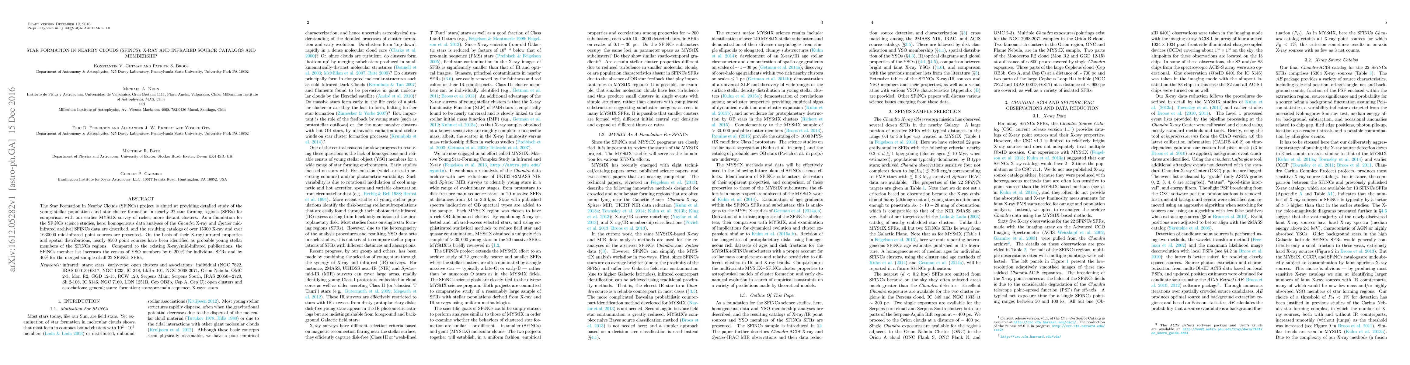 The Star Formation in Nearby Clouds (SFiNCs) project is aimed at providing detailed study of the young stellar populations and star cluster formation in nearby 22 star forming regions (SFRs) for comparison with our earlier MYStIX survey of richer, more distant clusters. As a foundation for the SFiNCs science studies, here, homogeneous data analyses of the Chandra X-ray and Spitzer mid-infrared archival SFiNCs data are described, and the resulting catalogs of over 15300 X-ray and over 1630000 mid-infrared point sources are presented. On the basis of their X-ray/infrared properties and spatial distributions, nearly 8500 point sources have been identified as probable young stellar members of the SFiNCs regions. Compared to the existing X-ray/mid-infrared publications, the SFiNCs member list increases the census of YSO members by 6-200% for individual SFRs and by 40% for the merged sample of all 22 SFiNCs SFRs.