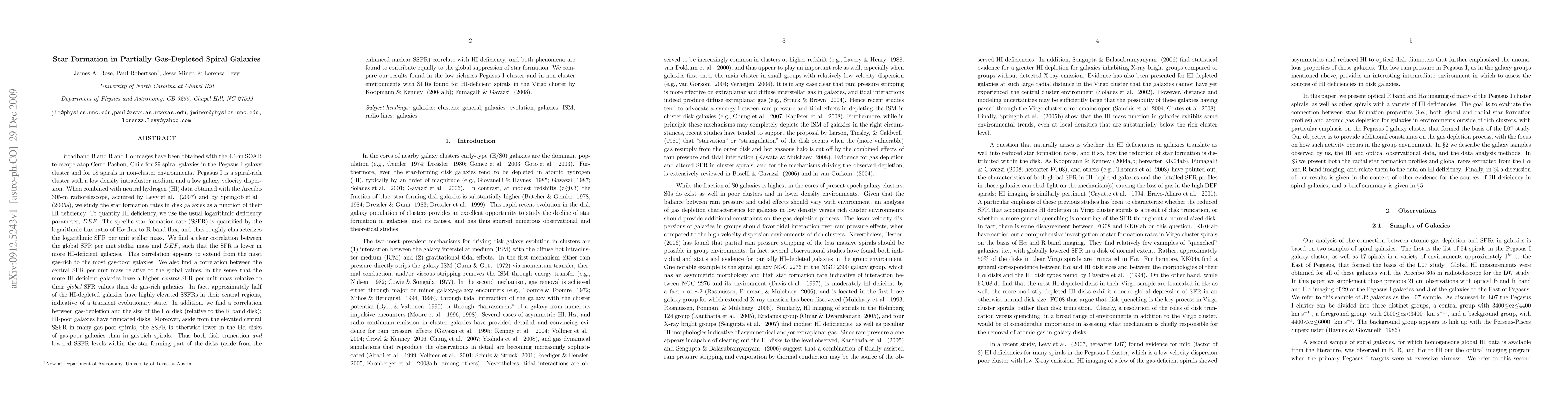 This study investigates star formation in 29 Pegasus I cluster and 18 non-cluster spiral galaxies using B, R, and H-alpha images, finding that star formation rates (SFR) are lower in gas-deficient galaxies. It reveals a correlation between gas deficiency and elevated central SFRs in gas-poor galaxies, suggesting a transient evolutionary state.