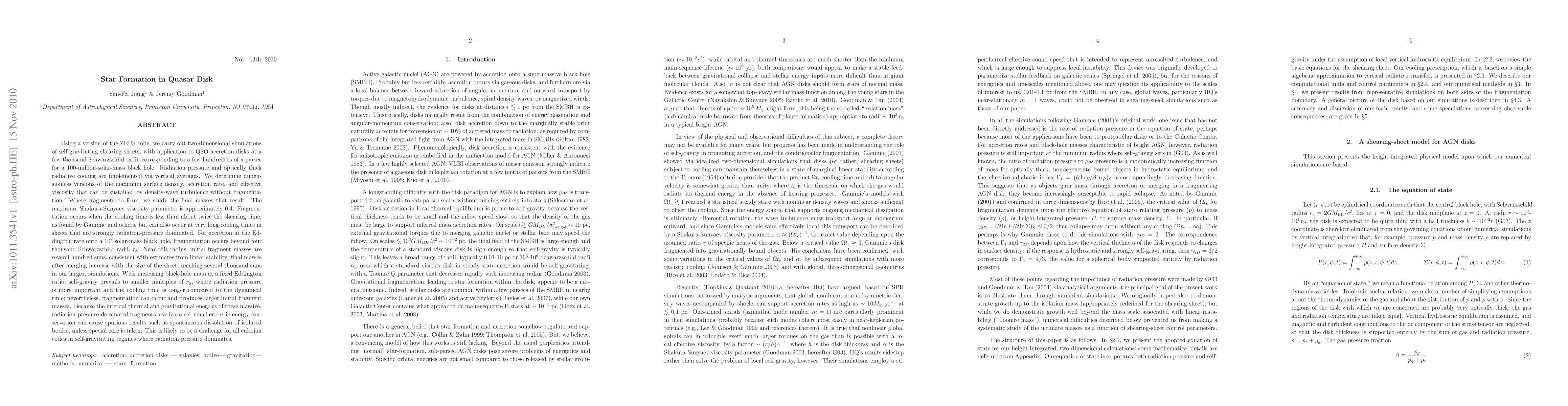 Using a version of the ZEUS code, we carry out two-dimensional simulations of self-gravitating shearing sheets, with application to QSO accretion disks at a few thousand Schwarzschild radii, corresponding to a few hundredths of a parsec for a 10^8 solar-mass black hole. Radiation pressure and optically thick radiative cooling are implemented via vertical averages. We determine dimensionless versions of the maximum surface density, accretion rate, and effective viscosity that can be sustained by density-wave turbulence without fragmentation. Where fragments do form, we study the final masses that result. The maximum Shakura-Sunyaev viscosity parameter is approximately 0.4. Fragmentation occurs when the cooling time is less than about twice the shearing time, as found by Gammie and others, but can also occur at very long cooling times in sheets that are strongly radiation-pressure dominated. For accretion at the Eddington rate onto a 10^8 solar-mass black hole, fragmentation occurs beyond four thousand Schwarzschild radii, r_s. Near this radius, initial fragment masses are several hundred suns, consistent with estimates from linear stability; final masses after merging increase with the size of the sheet, reaching several thousand suns in our largest simulations. With increasing black-hole mass at a fixed Eddington ratio, self-gravity prevails to smaller multiples of r_s, where radiation pressure is more important and the cooling time is longer compared to the dynamical time; nevertheless, fragmentation can occur and produces larger initial fragment masses. We also find energy conservation is likely to be a challenge for all eulerian codes in self-gravitating regimes where radiation pressure dominates.