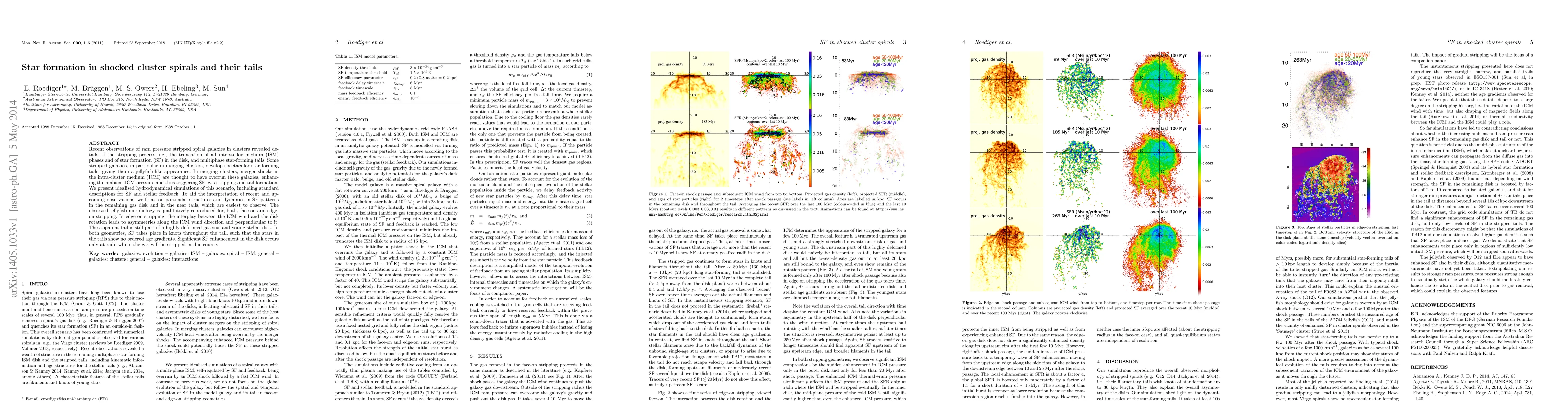 Recent observations of ram pressure stripped spiral galaxies in clusters revealed details of the stripping process, i.e., the truncation of all interstellar medium (ISM) phases and of star formation (SF) in the disk, and multiphase star-forming tails. Some stripped galaxies, in particular in merging clusters, develop spectacular star-forming tails, giving them a jellyfish-like appearance. In merging clusters, merger shocks in the intra-cluster medium (ICM) are thought to have overrun these galaxies, enhancing the ambient ICM pressure and thus triggering SF, gas stripping and tail formation. We present idealised hydrodynamical simulations of this scenario, including standard descriptions for SF and stellar feedback. To aid the interpretation of recent and upcoming observations, we focus on particular structures and dynamics in SF patterns in the remaining gas disk and in the near tails, which are easiest to observe. The observed jellyfish morphology is qualitatively reproduced for, both, face-on and edge-on stripping. In edge-on stripping, the interplay between the ICM wind and the disk rotation leads to asymmetries along the ICM wind direction and perpendicular to it. The apparent tail is still part of a highly deformed gaseous and young stellar disk. In both geometries, SF takes place in knots throughout the tail, such that the stars in the tails show no ordered age gradients. Significant SF enhancement in the disk occurs only at radii where the gas will be stripped in due course.