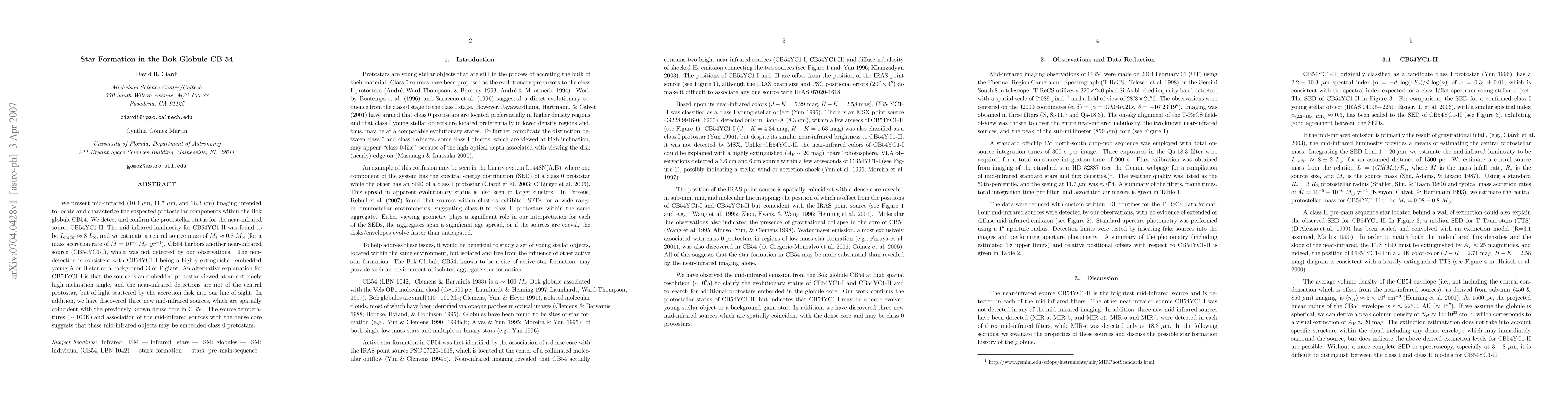 We present mid-infrared (10.4 \micron, 11.7 \micron, and 18.3 \micron) imaging intended to locate and characterize the suspected protostellar components within the Bok globule CB54. We detect and confirm the protostellar status for the near-infrared source CB54YC1-II. The mid-infrared luminosity for CB54YC1-II was found to be $L_{midir} \approx 8 L_\sun$, and we estimate a central source mass of $M_* \approx 0.8 M_\sun$ (for a mass accretion rate of ${\dot M}=10^{-6} M_\sun yr^{-1}$). CB54 harbors another near-infrared source (CB54YC1-I), which was not detected by our observations. The non-detection is consistent with CB54YC1-I being a highly extinguished embedded young A or B star or a background G or F giant. An alternative explanation for CB54YC1-I is that the source is an embedded protostar viewed at an extremely high inclination angle, and the near-infrared detections are not of the central protostar, but of light scattered by the accretion disk into our line of sight. In addition, we have discovered three new mid-infrared sources, which are spatially coincident with the previously known dense core in CB54. The source temperatures ($\sim100$K) and association of the mid-infrared sources with the dense core suggests that these mid-infrared objects may be embedded class 0 protostars.