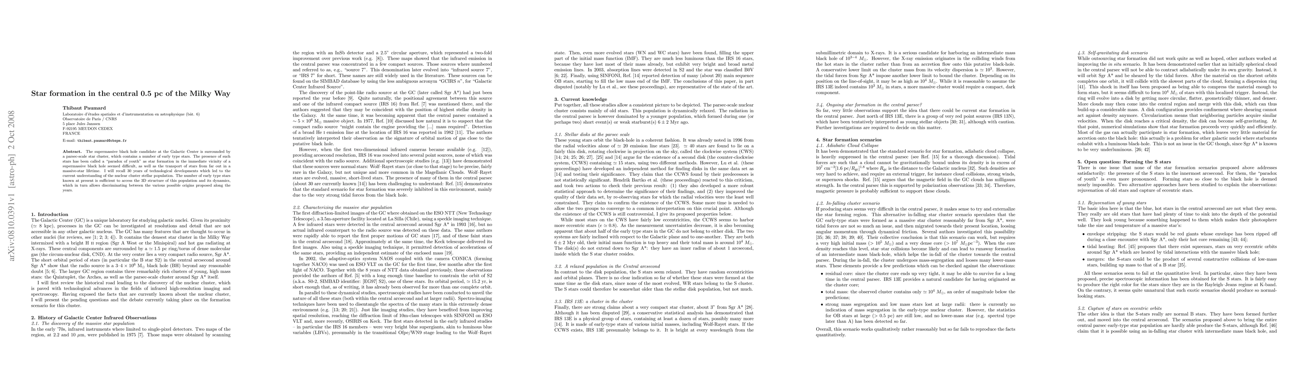 The supermassive black hole candidate at the Galactic Center is surrounded by a parsec-scale star cluster, which contains a number of early type stars. The presence of such stars has been called a "paradox of youth" as star formation in the immediate vicinity of a supermassive black hole seemed difficult, as well as the transport of stars from far out in a massive-star lifetime. I will recall 30 years of technological developments which led to the current understanding of the nuclear cluster stellar population. The number of early type stars known at present is sufficient to access the 3D structure of this population and its dynamics, which in turn allows discriminating between the various possible origins proposed along the years.