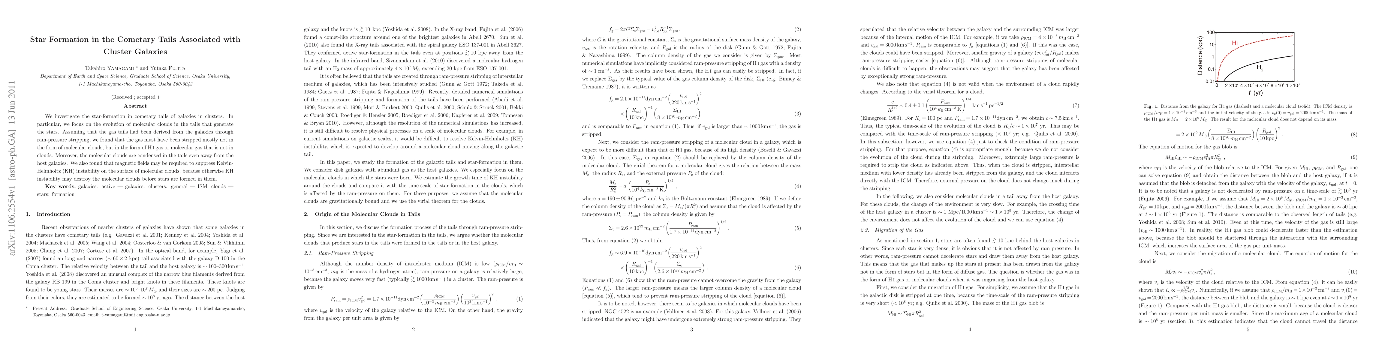 We investigate the star-formation in cometary tails of galaxies in clusters. In particular, we focus on the evolution of molecular clouds in the tails that generate the stars. Assuming that the gas tails had been derived from the galaxies through ram-pressure stripping, we found that the gas must have been stripped mostly not in the form of molecular clouds, but in the form of HI gas or molecular gas that is not in clouds. Moreover, the molecular clouds are condensed in the tails even away from the host galaxies. We also found that magnetic fields may be required to suppress Kelvin-Helmholtz (KH) instability on the surface of molecular clouds, because otherwise KH instability may destroy the molecular clouds before stars are formed in them.