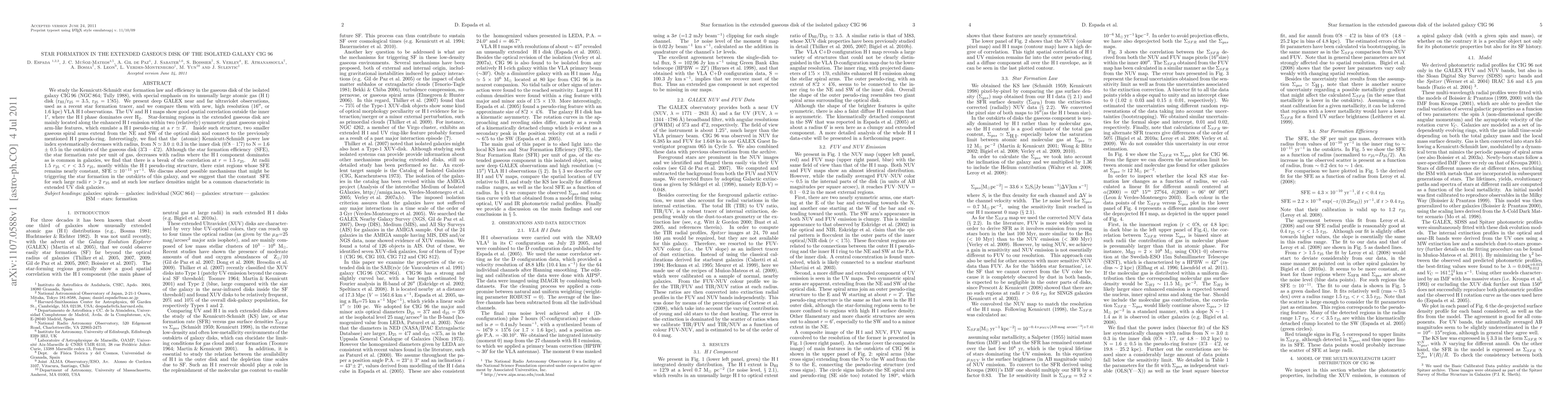We study the Kennicutt-Schmidt star formation law and efficiency in the gaseous disk of the isolated galaxy CIG 96 (NGC 864), with special emphasis on its unusually large atomic gas (HI) disk (r_HI/r_25 = 3.5, r_25 = 1.'85). We present deep GALEX near and far ultraviolet observations, used as a recent star formation tracer, and we compare them with new, high resolution (16", or 1.6 kpc) VLA HI observations. The UV and HI maps show good spatial correlation outside the inner 1', where the HI phase dominates over H_2. Star-forming regions in the extended gaseous disk are mainly located along the enhanced HI emission within two (relatively) symmetric giant gaseous spiral arm-like features, which emulate a HI pseudo-ring at a r \simeq 3' . Inside such structure, two smaller gaseous spiral arms extend from the NE and SW of the optical disk and connect to the previously mentioned HI pseudo-ring. Interestingly, we find that the (atomic) Kennicutt-Schmidt power law index systematically decreases with radius, from N \simeq 3.0 +- 0.3 in the inner disk (0.'8 - 1.'7) to N = 1.6 +- 0.5 in the outskirts of the gaseous disk (3.'3 - 4.'2). Although the star formation efficiency (SFE), the star formation rate per unit of gas, decreases with radius where the HI component dominates as is common in galaxies, we find that there is a break of the correlation at r = 1.5 r_25. At radii 1.5 r_25 < r < 3.5 r_25, mostly within the HI pseudo-ring structure, there exist regions whose SFE remains nearly constant, SFE \simeq 10^-11 yr^-1. We discuss about possible mechanisms that might be triggering the star formation in the outskirts of this galaxy, and we suggest that the constant SFE for such large radii r > 2 r_25 and at such low surface densities might be a common characteristic in extended UV disk galaxies.