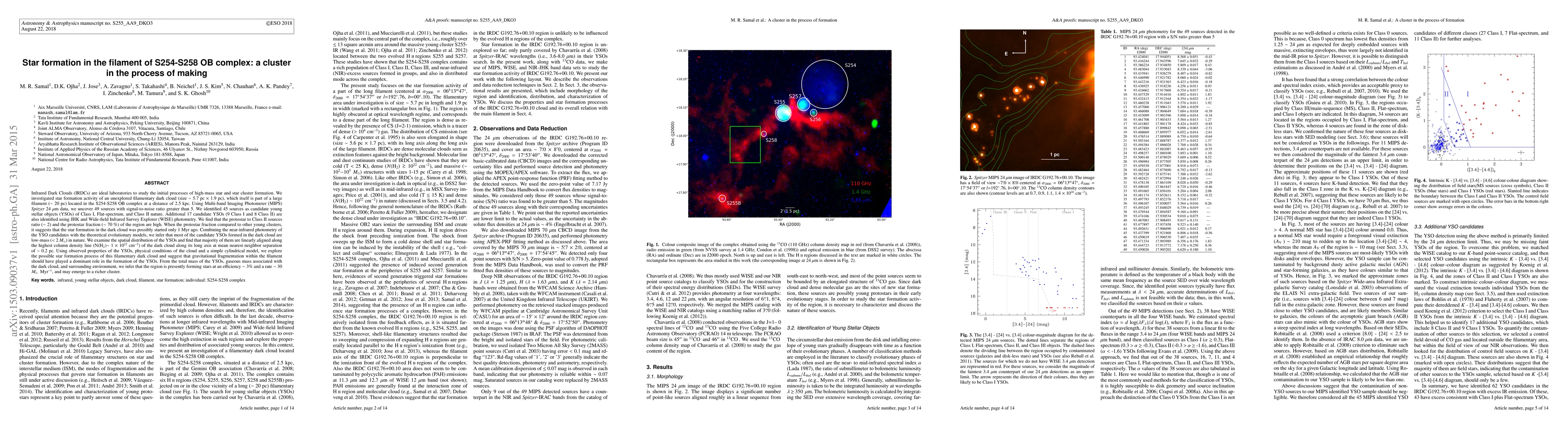 Infrared Dark Clouds are ideal laboratories to study the initial processes of high-mass star and star cluster formation. We investigated star formation activity of an unexplored filamentary dark cloud (~5.7pc x 1.9pc), which itself is part of a large filament (~20pc) located in the S254-S258 OB complex at a distance of 2.5kpc. Using MIPS Spitzer 24 micron data, we uncover 49 sources with SNR greater than 5. We identified 45 sources as candidate YSOs of Class I, Flat-spectrum & Class II nature. Additional 17 candidate YSOs (9 Class I & 8 Class II) are also identified using JHK and WISE photometry. We find that the protostar to Class II sources ratio (~2) and the protostar fraction (~70%) of the region are high. When the protostar fraction compared to other young clusters, it suggests that the star formation in the dark cloud was possibly started only 1 Myr ago. Combining the NIR photometry of the YSO candidates with the theoretical evolutionary models, we infer that most of the candidate YSOs formed in the dark cloud are low-mass (<2 Msolar) in nature. We examine the spatial distribution of the YSOs and find that majority of them are linearly aligned along the highest column density line (N(H2) ~1 x 10^22 cm^-2) of the dark cloud along its long axis at mean nearest neighbor separation of ~0.2pc. Using observed properties of the YSOs, physical conditions of the cloud and a simple cylindrical model, we explore the possible star formation process of this filamentary dark cloud and suggest that gravitational fragmentation within the filament should have played a dominant role in the formation of the YSOs. From the total mass of the YSOs, gaseous mass associated with the dark cloud, and surrounding environment, we infer that the region is presently forming stars at an efficiency ~3% and a rate ~30 Msolar Myr^-1, and may emerge to a richer cluster.