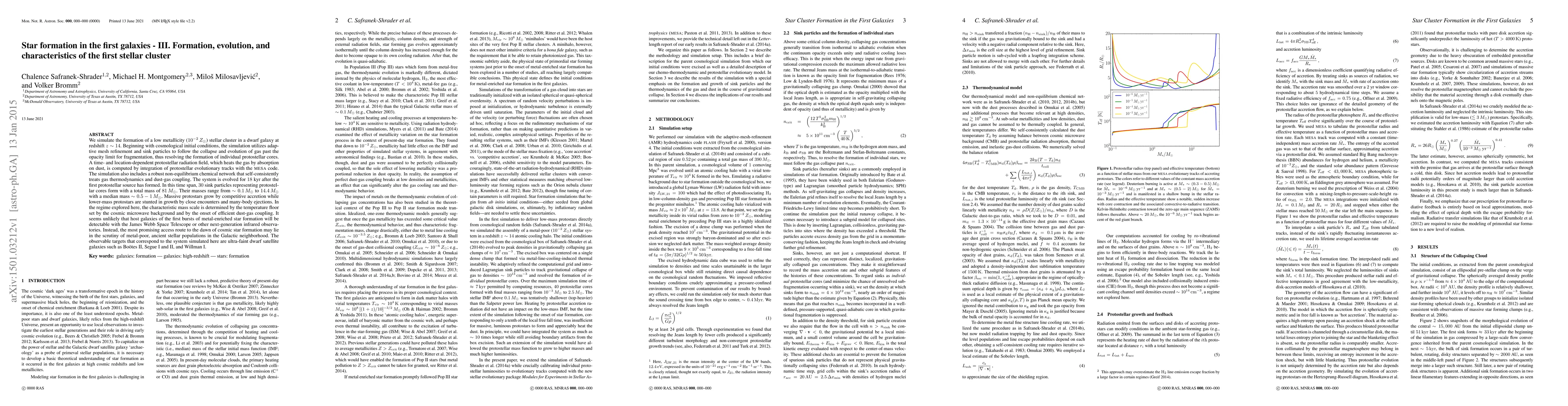 Researchers simulate the formation of a first stellar cluster in a galaxy at z~14, finding 30 protostellar cores with masses between ~0.1 Msun to 14.4 Msun, suggesting that host galaxies may not be detectable by next-generation telescopes.