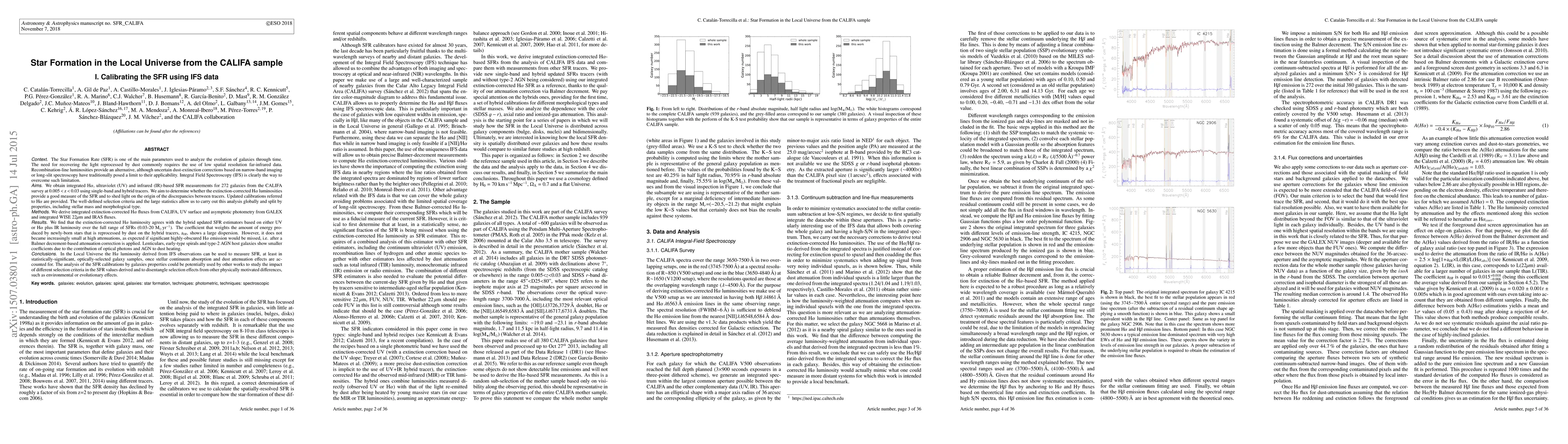 The Star Formation Rate (SFR) is one of the main parameters used to analyze the evolution of galaxies through time. The need for recovering the light reprocessed by dust commonly requires the use of low spatial resolution far-infrared data. Recombination-line luminosities provide an alternative, although uncertain dust-extinction corrections based on narrow-band imaging or long-slit spectroscopy have traditionally posed a limit to their applicability. Integral Field Spectroscopy (IFS) is clearly the way to overcome such limitation. We obtain integrated H{\alpha}, ultraviolet (UV) and infrared (IR)-based SFR measurements for 272 galaxies from the CALIFA survey at 0.005 < z < 0.03 using single-band and hybrid tracers. We provide updated calibrations, both global and split by properties (including stellar mass and morphological type), referred to H{\alpha}. The extinction-corrected H{\alpha} luminosity agrees with the updated hybrid SFR estimators based on either UV or H{\alpha} plus IR luminosity over the full range of SFRs (0.03-20 M$_{\odot}$ yr$^{-1}$). The coefficient that weights the amount of energy produced by newly-born stars that is reprocessed by dust on the hybrid tracers, a$_{IR}$, shows a large dispersion. However, it does not became increasingly small at high attenuations, as expected if significant highly-obscured H$\alpha$ emission would be missed. Lenticulars, early-type spirals and type-2 AGN host galaxies show smaller coefficients due to the contribution of optical photons and AGN to dust heating. In the Local Universe the H{\alpha} luminosity derived from IFS observations can be used to measure SFR, at least in statistically-significant, optically-selected galaxy samples. The analysis of the SFR calibrations by galaxies properties could be potentially used by other works to study the impact of different selection criteria in the SFR values derived.