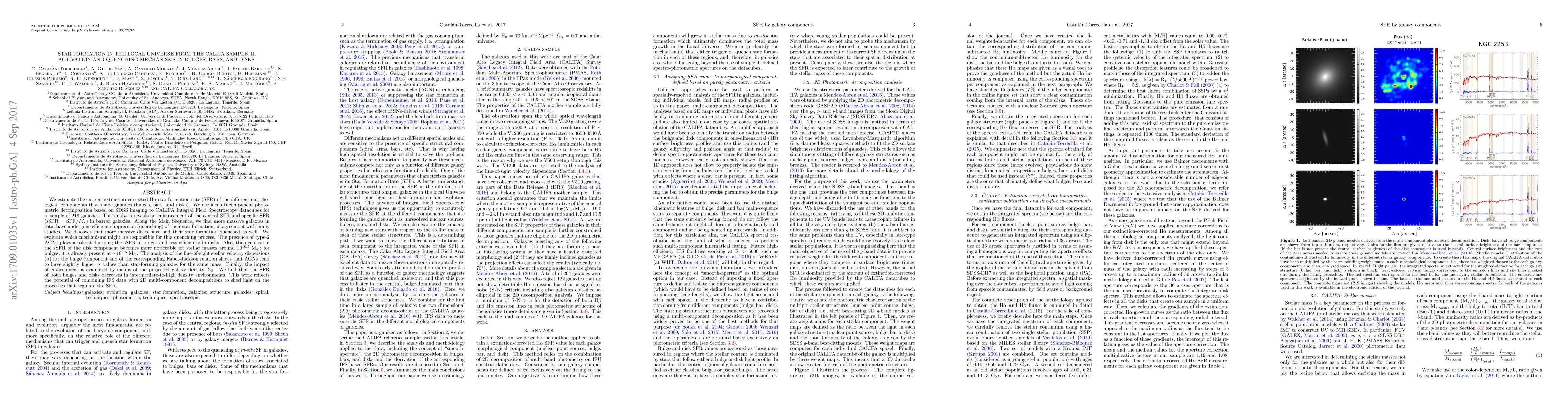 We estimate the current extinction-corrected H$\alpha$ star formation rate (SFR) of the different morphological components that shape galaxies (bulges, bars, and disks). We use a multi-component photometric decomposition based on SDSS imaging to CALIFA Integral Field Spectroscopy datacubes for a sample of 219 galaxies. This analysis reveals an enhancement of the central SFR and specific SFR (sSFR $=$ SFR/$M_{\star}$) in barred galaxies. Along the Main Sequence, we find more massive galaxies in total have undergone efficient suppression (quenching) of their star formation, in agreement with many studies. We discover that more massive disks have had their star formation quenched as well. We evaluate which mechanisms might be responsible for this quenching process. The presence of type-2 AGNs plays a role at damping the sSFR in bulges and less efficiently in disks. Also, the decrease in the sSFR of the disk component becomes more noticeable for stellar masses around 10$^{10.5}$ M$_{\odot}$; for bulges, it is already present at $\sim$10$^{9.5}$ M$_{\odot}$. The analysis of the line-of-sight stellar velocity dispersions ($\sigma$) for the bulge component and of the corresponding Faber-Jackson relation shows that AGNs tend to have slightly higher $\sigma$ values than star-forming galaxies for the same mass. Finally, the impact of environment is evaluated by means of the projected galaxy density, $\Sigma$$_{5}$. We find that the SFR of both bulges and disks decreases in intermediate-to-high density environments. This work reflects the potential of combining IFS data with 2D multi-component decompositions to shed light on the processes that regulate the SFR.