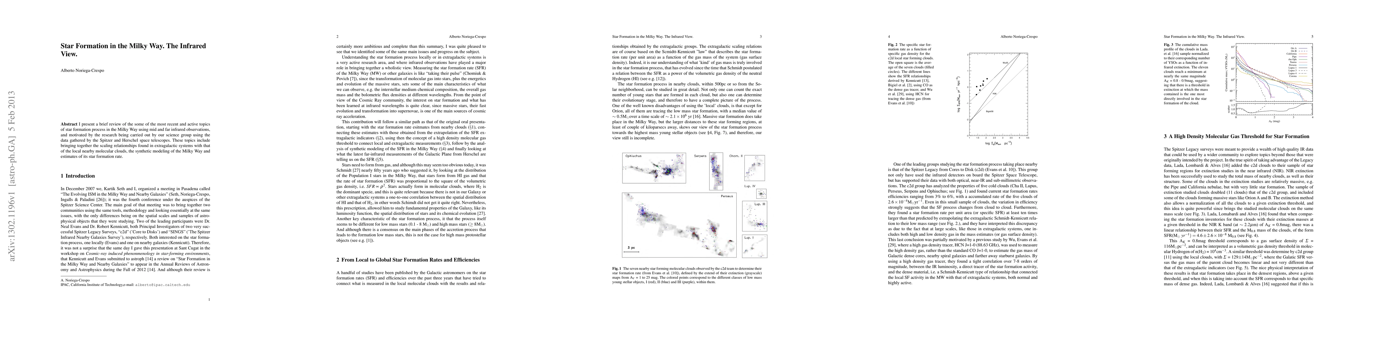 This paper reviews recent findings on star formation in the Milky Way using mid and far infrared observations from Spitzer and Herschel telescopes, focusing on scaling relationships between extragalactic systems and local molecular clouds, as well as synthetic modeling and star formation rate estimates.