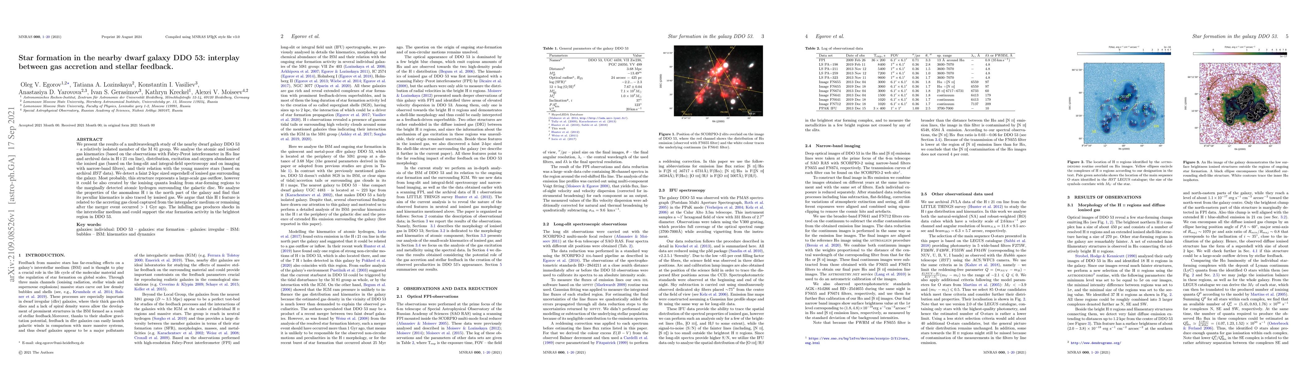 We present the results of a multiwavelength study of the nearby dwarf galaxy DDO 53 - a relatively isolated member of the M 81 group. We analyse the atomic and ionised gas kinematics (based on the observations with Fabry-Perot interferometer in H$\alpha$ line and archival data in HI 21 cm line), distribution, excitation and oxygen abundance of the ionised gas (based on the long-slit and integral-field spectroscopy and on imaging with narrow-band filters), and their relation with the young massive stars (based on archival HST data). We detect a faint 2-kpc sized supershell of ionised gas surrounding the galaxy. Most probably, this structure represents a large-scale gas outflow, however it could be also created by the ionising quanta leaking from star-forming regions to the marginally detected atomic hydrogen surrounding the galactic disc. We analyse the properties of the anomalous HI in the north part of the galaxy and find that its peculiar kinematics is also traced by ionised gas. We argue that this HI feature is related to the accreting gas cloud captured from the intergalactic medium or remaining after the merger event occurred >1 Gyr ago. The infalling gas produces shocks in the interstellar medium and could support the star formation activity in the brightest region in DDO 53.