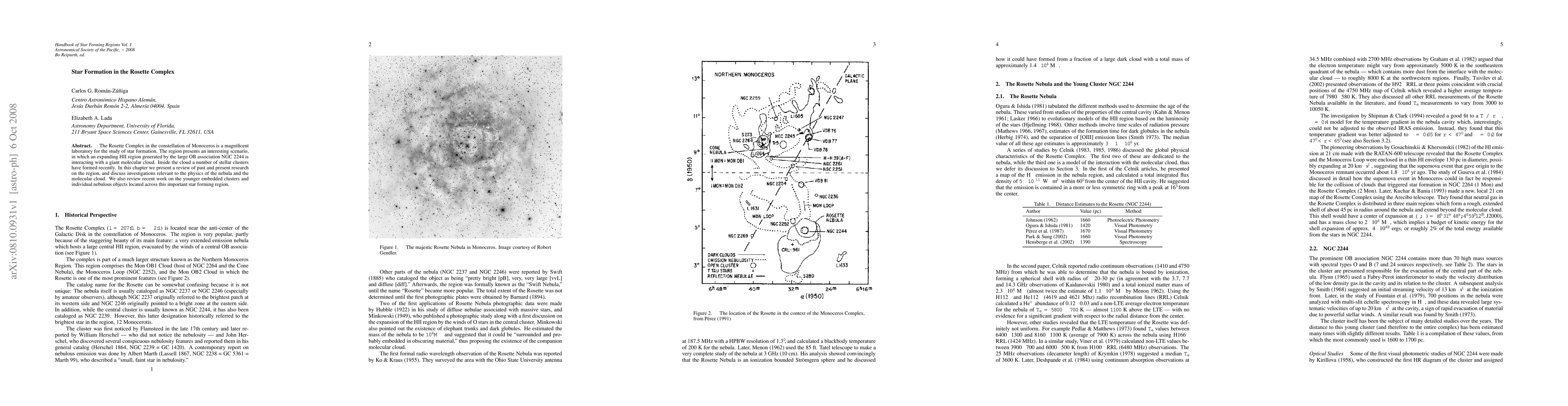 The Rosette Complex in the constellation of Monoceros is a magnificent laboratory for the study of star formation. The region presents an interesting scenario, in which an expanding HII region generated by the large OB association NGC 2244 is interacting with a giant molecular cloud. Inside the cloud a number of stellar clusters have formed recently. In this chapter we present a review of past and present research on the region, and discuss investigations relevant to the physics of the nebula and the molecular cloud. We also review recent work on the younger embedded clusters and individual nebulous objects located across this important star forming region.