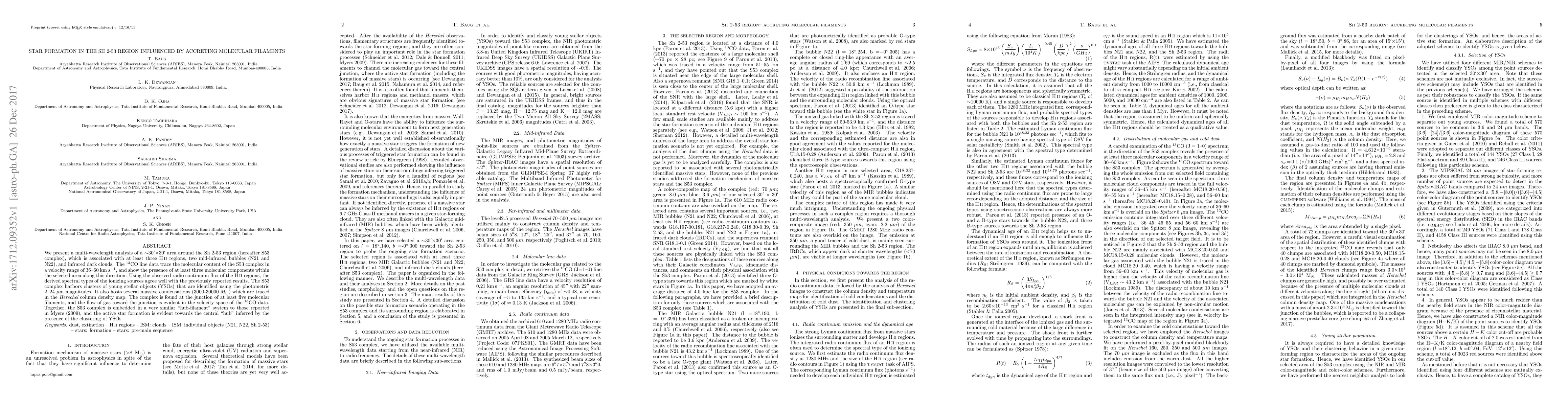 The research examines the Sh 2-53 region, revealing a star formation complex with at least three H II regions and infrared dark clouds. Using multi-wavelength analysis and 13CO line data, the study identifies three molecular components, massive condensations, and a 'hub-filament' system, indicating active star formation driven by accreting molecular filaments.