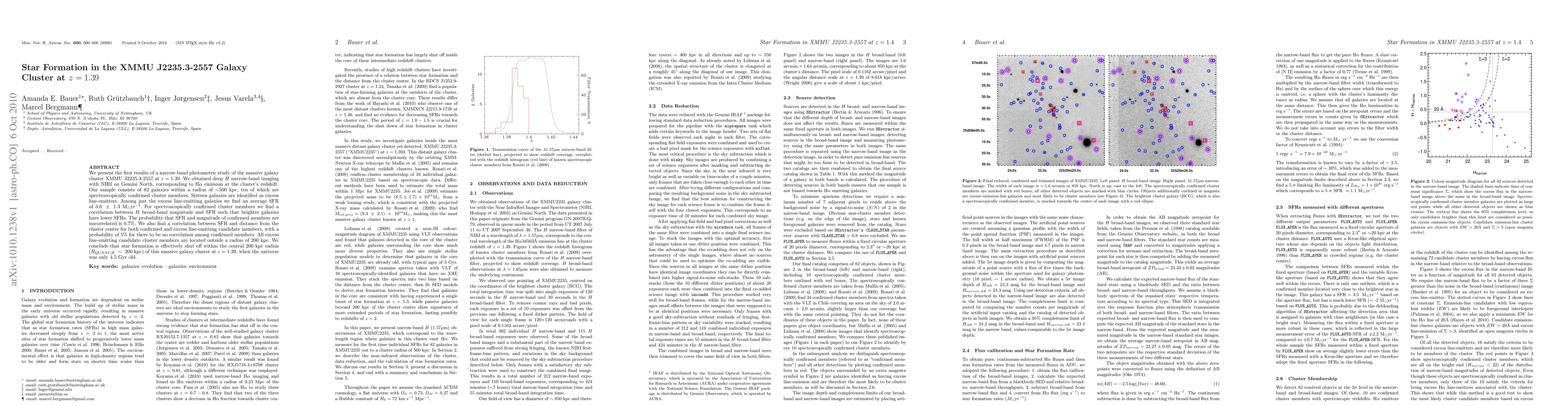 We present the first results of a narrow-band photometric study of the massive galaxy cluster XMMU J2235.3-2557 at z=1.39. We obtained deep $H$ narrow-band imaging with NIRI on Gemini North, corresponding to H-alpha emission at the cluster's redshift. Our sample consists of 82 galaxies within a radius of ~500 kpc, ten of which are spectroscopically confirmed cluster members. Sixteen galaxies are identified as excess line-emitters. Among just the excess line-emitting galaxies we find an average SFR of 3.6 +/- 1.3 Msun/yr. For spectroscopically confirmed cluster members we find a correlation between H broad-band magnitude and SFR such that brighter galaxies have lower SFRs. The probability that SFR and magnitude of confirmed members are uncorrelated is 0.7%. We also find a correlation between SFR and distance from the cluster centre for both confirmed and excess line-emitting candidate members, with a probability of 5% for there to be no correlation among confirmed members. All excess line-emitting candidate cluster members are located outside a radius of 200 kpc. We conclude that star formation is effectively shut off within the central 200 kpc radius (R_QUENCH ~ 200 kpc) of this massive galaxy cluster at z=1.39, when the universe was only 4.5 Gyr old.