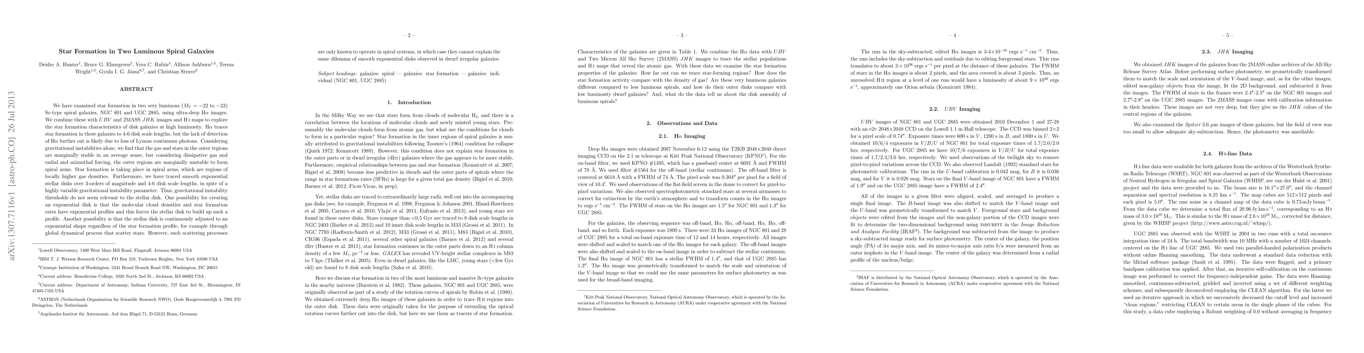 This study investigates star formation in two luminous spiral galaxies, NGC 801 and UGC 2885, using Halpha imaging and other observational data. It finds that star formation predominantly occurs in spiral arms due to higher gas densities, while the outer regions are marginally unstable, suggesting that gravitational instability thresholds do not govern the formation of smooth exponential stellar disks.