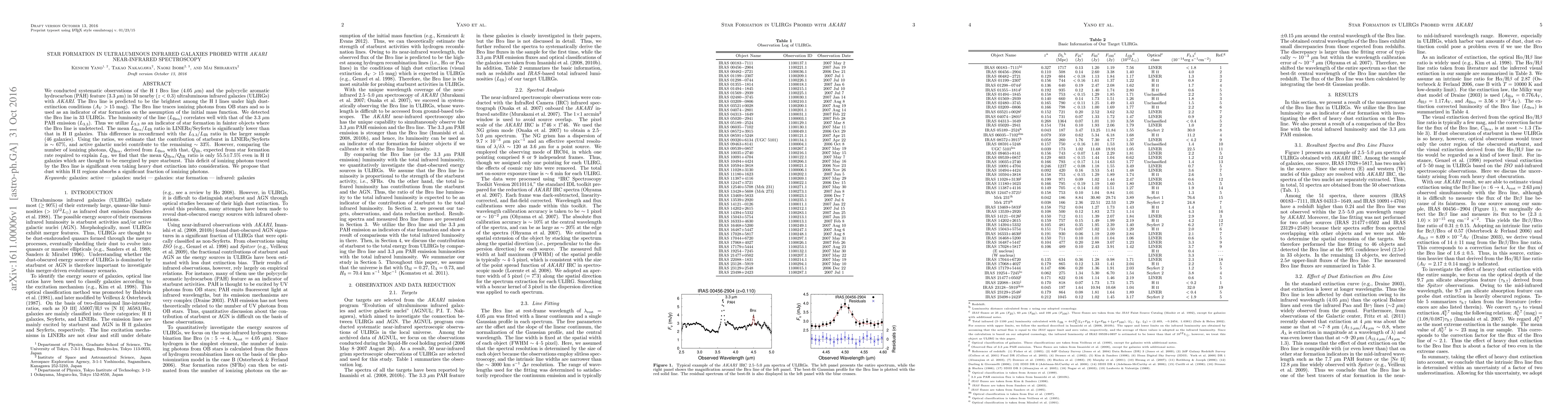 We conducted systematic observations of the HI Br-alpha line (4.05 micron) and the polycyclic aromatic hydrocarbon (PAH) feature (3.3 micron) in 50 nearby (z<0.3) ultraluminous infrared galaxies (ULIRGs) with AKARI. The Br-alpha line is predicted to be the brightest among the HI lines under high dust-extinction conditions (A_V>15 mag). The Br-alpha line traces ionizing photons from OB stars and so is used as an indicator of star formation on the assumption of the initial mass function. We detected the Br-alpha line in 33 ULIRGs. The luminosity of the line (L_BrA) correlates well with that of the 3.3 micron PAH emission (L_3.3). Thus we utilize L_3.3 as an indicator of star formation in fainter objects where the Br-alpha line is undetected. The mean L_BrA/L_IR ratio in LINERs/Seyferts is significantly lower than that in HII galaxies. This difference is reconfirmed with the L_3.3/L_IR ratio in the larger sample (46 galaxies). Using the ratios, we estimate that the contribution of starburst in LINERs/Seyferts is ~67%, and active galactic nuclei contribute to the remaining ~33%. However, comparing the number of ionizing photons, Q_BrA, derived from L_BrA with that, Q_IR, expected from star formation rate required to explain L_IR, we find that the mean Q_BrA/Q_IR ratio is only 55.5+/-7.5% even in HII galaxies which are thought to be energized by pure starburst. This deficit of ionizing photons traced by the Br-alpha line is significant even taking heavy dust extinction into consideration. We propose that dust within HII regions absorbs a significant fraction of ionizing photons.