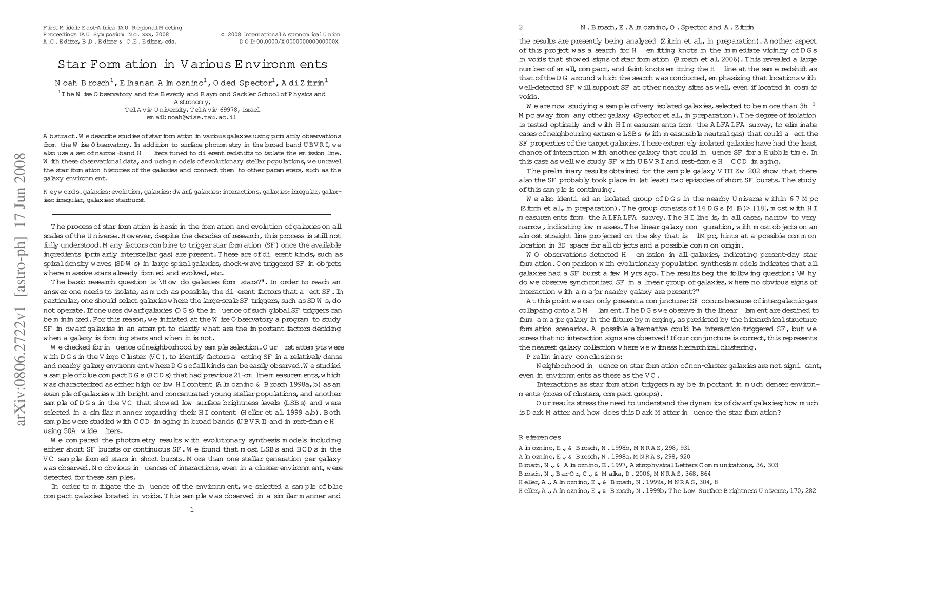 We describe studies of star formation in various galaxies using primarily observations from the Wise Observatory. In addition to surface photometry in the broad band UBVRI, we also use a set of narrow-band H-alpha filters tuned to different redshifts to isolate the emission line. With these observational data, and using models of evolutionary stellar populations, we unravel the star formation histories of the galaxies and connect them to other parameters, such as the galaxy environment.