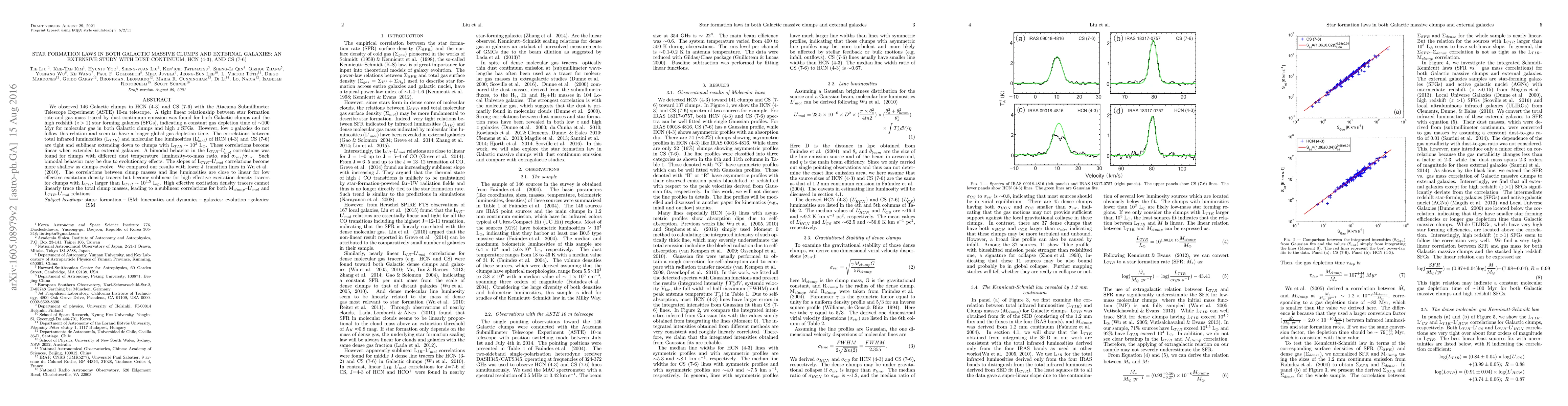 We observed 146 Galactic clumps in HCN (4-3) and CS (7-6) with the Atacama Submillimeter Telescope Experiment (ASTE) 10-m telescope. A tight linear relationship between star formation rate and gas mass traced by dust continuum emission was found for both Galactic clumps and the high redshift (z>1) star forming galaxies (SFGs), indicating a constant gas depletion time of ~100 Myr for molecular gas in both Galactic clumps and high z SFGs. However, low z galaxies do not follow this relation and seem to have a longer global gas depletion time. The correlations between total infrared luminosities (L_TIR) and molecular line luminosities (L'_mol) of HCN (4-3) and CS (7-6) are tight and sublinear extending down to clumps with LTIR~10^{3} L_sun. These correlations become linear when extended to external galaxies. A bimodal behavior in the LTIR--L'mol correlations was found for clumps with different dust temperature, luminosity-to-mass ratio, and sigmaline/sigmavir. Such bimodal behavior may be due to evolutionary effects. The slopes of LTIR--L'mol correlations become more shallow as clumps evolve. We compared our results with lower J transition lines in wu et al. (2010). The correlations between clump masses and line luminosities are close to linear for low effective excitation density tracers but become sublinear for high effective excitation density tracers for clumps with LTIR larger than LTIR~10^4.5 Lsun. High effective excitation density tracers cannot linearly trace the total clump masses, leading to a sublinear correlations for both Mclump-L'mol and LTIR-L'mol relations.