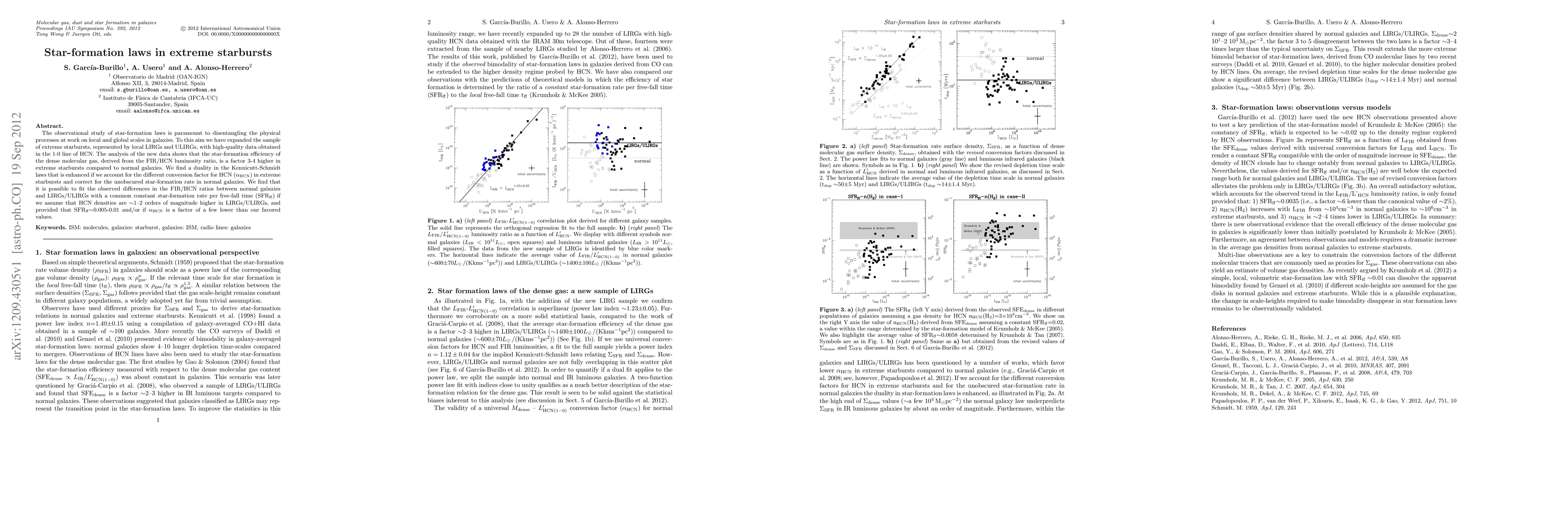 This study investigates the star-formation efficiency in extreme starbursts (LIRGs and ULIRGs) using HCN data, revealing that it is 3-4 times higher than in normal galaxies. The analysis shows a duality in the Kennicutt-Schmidt laws, suggesting that differences in HCN conversion factors and star-formation rates can be reconciled with a common star-formation rate per free-fall time.