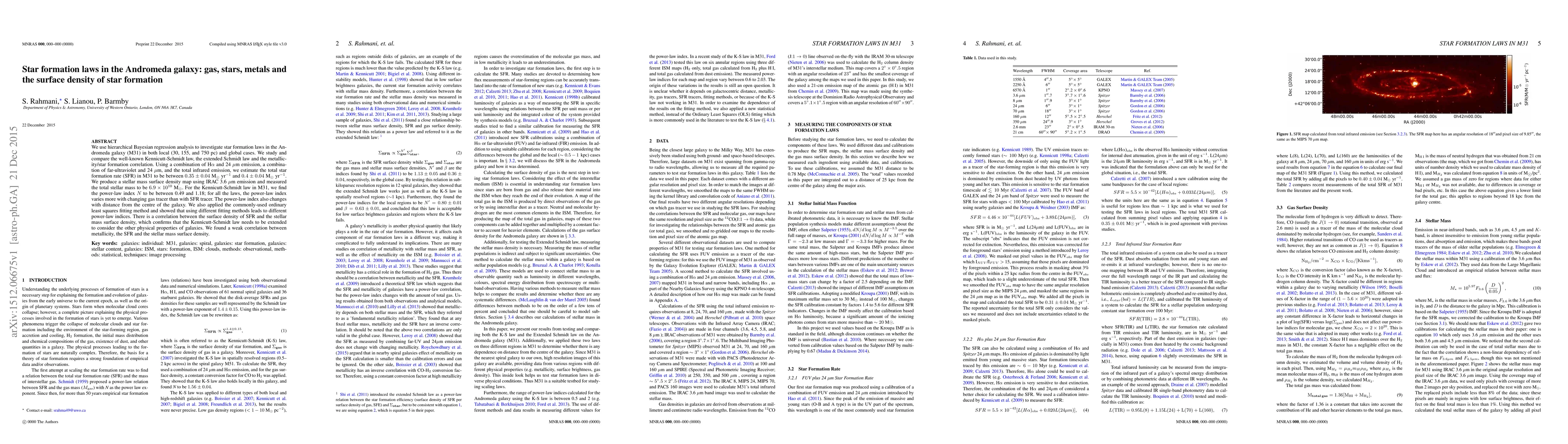 This paper uses Bayesian regression to analyze star formation laws in Andromeda galaxy (M31), comparing the Kennicutt-Schmidt law and metallicity correlations. The study finds variable power-law indices for different gas tracers and distances from the galactic center, and confirms the need to extend the Kennicutt-Schmidt law to include stellar mass surface density.