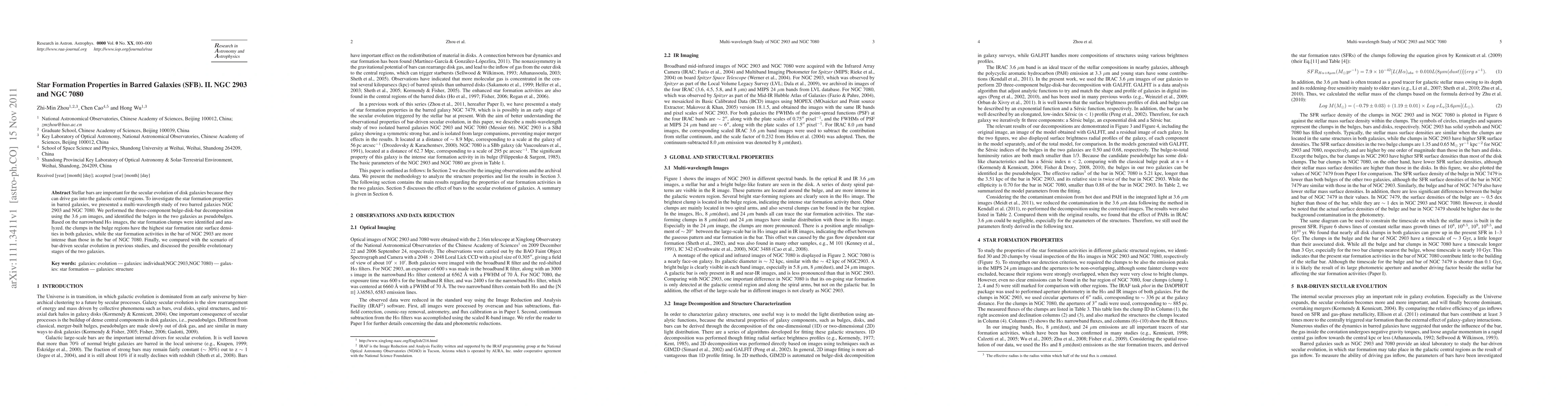 Stellar bars are important for the secular evolution of disk galaxies because they can drive gas into the galactic central regions. To investigate the star formation properties in barred galaxies, we presented a multi-wavelength study of two barred galaxies NGC 2903 and NGC 7080. We performed the three-component bulge-disk-bar decomposition using the 3.6 {\mu}m images, and identified the bulges in the two galaxies as pseudobulges. Based on the narrowband H{\alpha} images, the star formation clumps were identified and analyzed. the clumps in the bulge regions have the highest star formation rate surface densities in both galaxies, while the star formation activities in the bar of NGC 2903 are more intense than those in the bar of NGC 7080. Finally, we compared with the scenario of bar-driven secular evolution in previous studies, and discussed the possible evolutionary stages of the two galaxies.