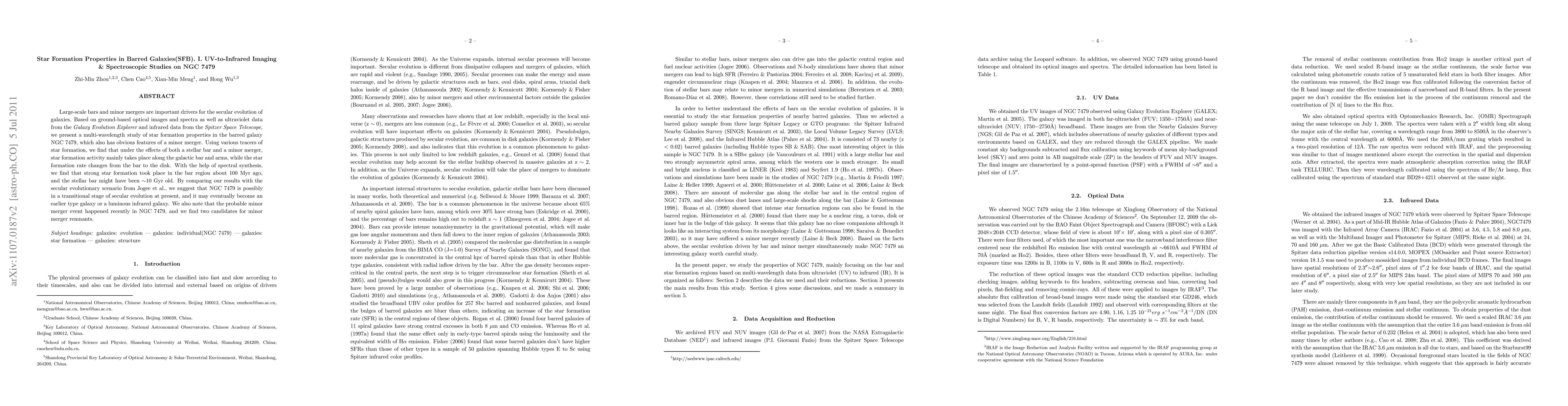 Large-scale bars and minor mergers are important drivers for the secular evolution of galaxies. Based on ground-based optical images and spectra as well as ultraviolet data from the Galaxy Evolution Explorer and infrared data from the Spitzer Space Telescope, we present a multi-wavelength study of star formation properties in the barred galaxy NGC 7479, which also has obvious features of a minor merger. Using various tracers of star formation, we find that under the effects of both a stellar bar and a minor merger, star formation activity mainly takes place along the galactic bar and arms, while the star formation rate changes from the bar to the disk. With the help of spectral synthesis, we find that strong star formation took place in the bar region about 100 Myr ago, and the stellar bar might have been $\sim$10 Gyr old. By comparing our results with the secular evolutionary scenario from Jogee et al., we suggest that NGC 7479 is possibly in a transitional stage of secular evolution at present, and it may eventually become an earlier type galaxy or a luminous infrared galaxy. We also note that the probable minor merger event happened recently in NGC 7479, and we find two candidates for minor merger remnants.