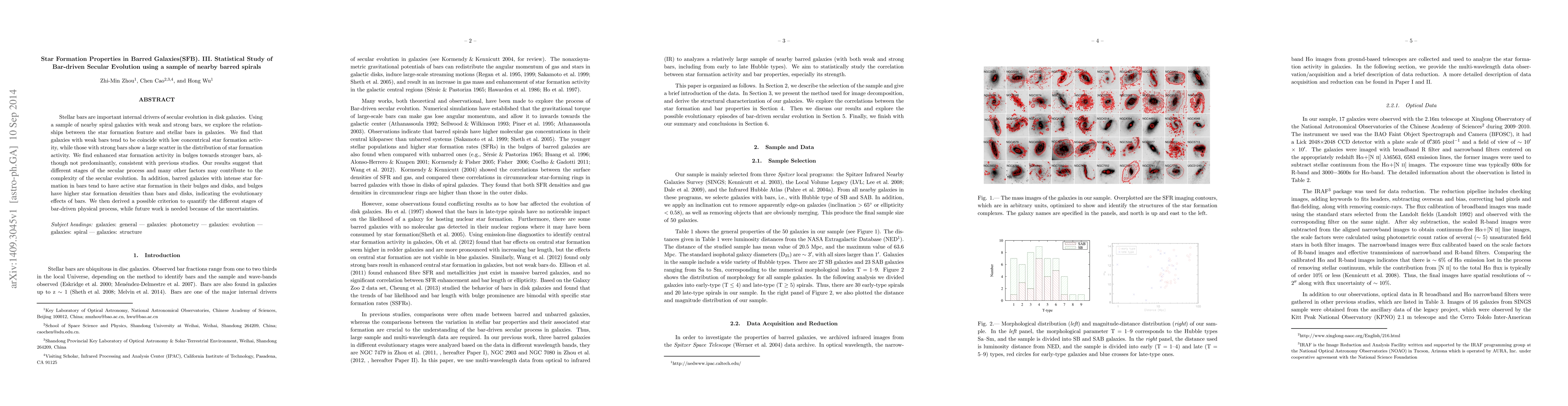 This study investigates the relationship between stellar bars and star formation in nearby barred spiral galaxies, finding that weak bars correlate with low star formation activity, while strong bars show a wide range of star formation patterns. The research suggests that bars drive complex secular evolution, with intense star formation in bars often linked to active star formation in bulges and disks.