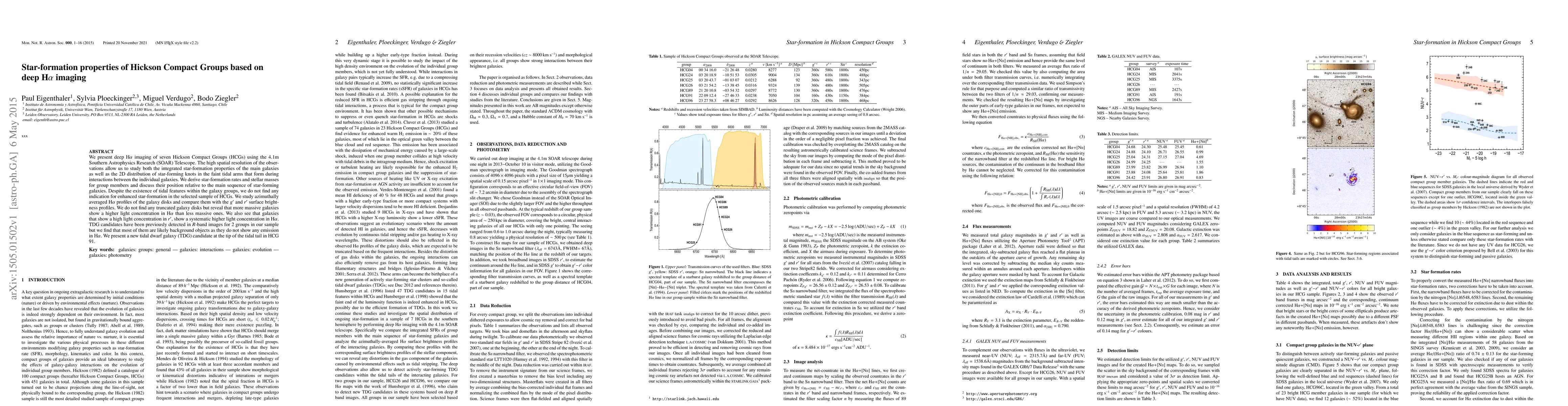 We present deep H{\alpha} imaging of seven Hickson Compact Groups (HCGs) using the 4.1m Southern Astrophysics Research (SOAR) Telescope. The high spatial resolution of the observations allow us to study both the integrated star-formation properties of the main galaxies as well as the 2D distribution of star-forming knots in the faint tidal arms that form during interactions between the individual galaxies. We derive star-formation rates and stellar masses for group members and discuss their position relative to the main sequence of star-forming galaxies. Despite the existence of tidal features within the galaxy groups, we do not find any indication for enhanced star-formation in the selected sample of HCGs. We study azimuthally averaged H{\alpha} profiles of the galaxy disks and compare them with the g' and r' surface-brightness profiles. We do not find any truncated galaxy disks but reveal that more massive galaxies show a higher light concentration in H{\alpha} than less massive ones. We also see that galaxies that show a high light concentration in r', show a systematic higher light concentration in H{\alpha}. TDG candidates have been previously detected in R-band images for 2 groups in our sample but we find that most of them are likely background objects as they do not show any emission in H{\alpha}. We present a new tidal dwarf galaxy (TDG) candidate at the tip of the tidal tail in HCG 91.