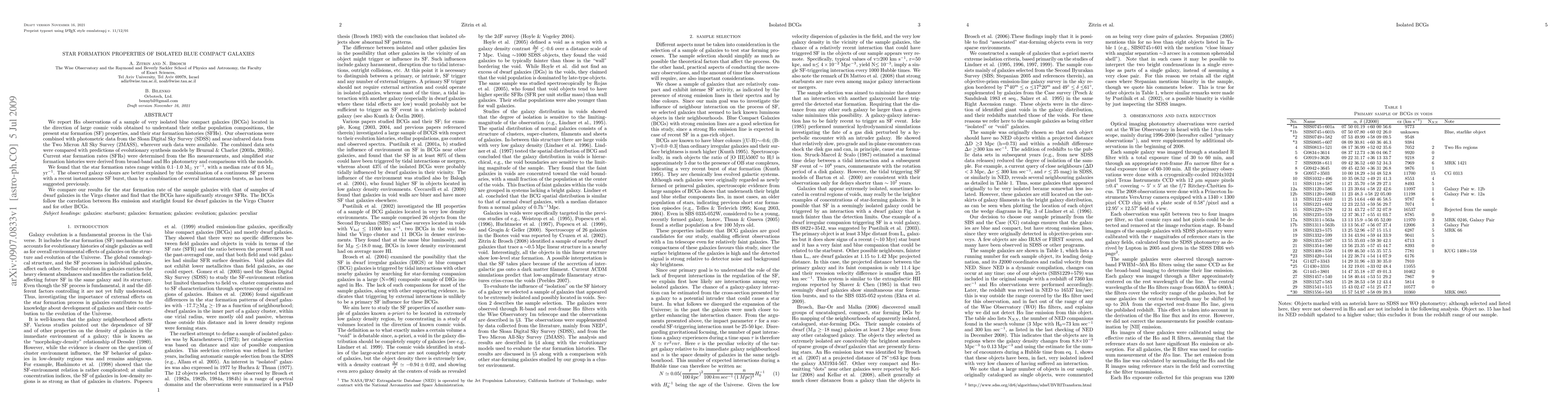 We report H$\alpha$ observations of a sample of very isolated blue compact galaxies (BCGs) located in the direction of large cosmic voids obtained to understand their stellar population compositions, the present star formation (SF) properties, and their star formation histories (SFHs). Our observations were combined with photometric data from the Sloan Digital Sky Survey (SDSS) and near-infrared data from the Two Micron All Sky Survey (2MASS), wherever such data were available. The combined data sets were compared with predictions of evolutionary synthesis models by Bruzual & Charlot (2003a, 2003b). Current star formation rates (SFRs) were determined from the H$\alpha$ measurements, and simplified star formation histories were derived from broad-band and H$\alpha$ photometry and comparisons with the models. We found that the star formation rates range within 0.1--1.0 M$_{\odot}$ yr$^{-1}$, with a median rate of 0.6 M$_{\odot}$ yr$^{-1}$. The observed galaxy colours are better explained by the combination of a continuous SF process with a recent instantaneous SF burst, than by a combination of several instantaneous bursts, as has been suggested previously. We compare our results for the star formation rate of the sample galaxies with that of samples of dwarf galaxies in the Virgo cluster and find that the BCGs have significantly stronger SFRs. The BCGs follow the correlation between H$\alpha$ emission and starlight found for dwarf galaxies in the Virgo Cluster and for other BCGs.